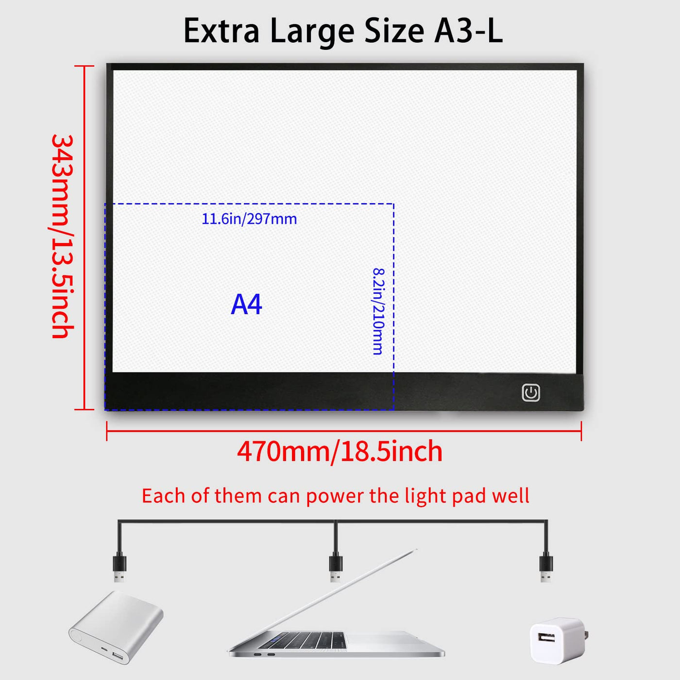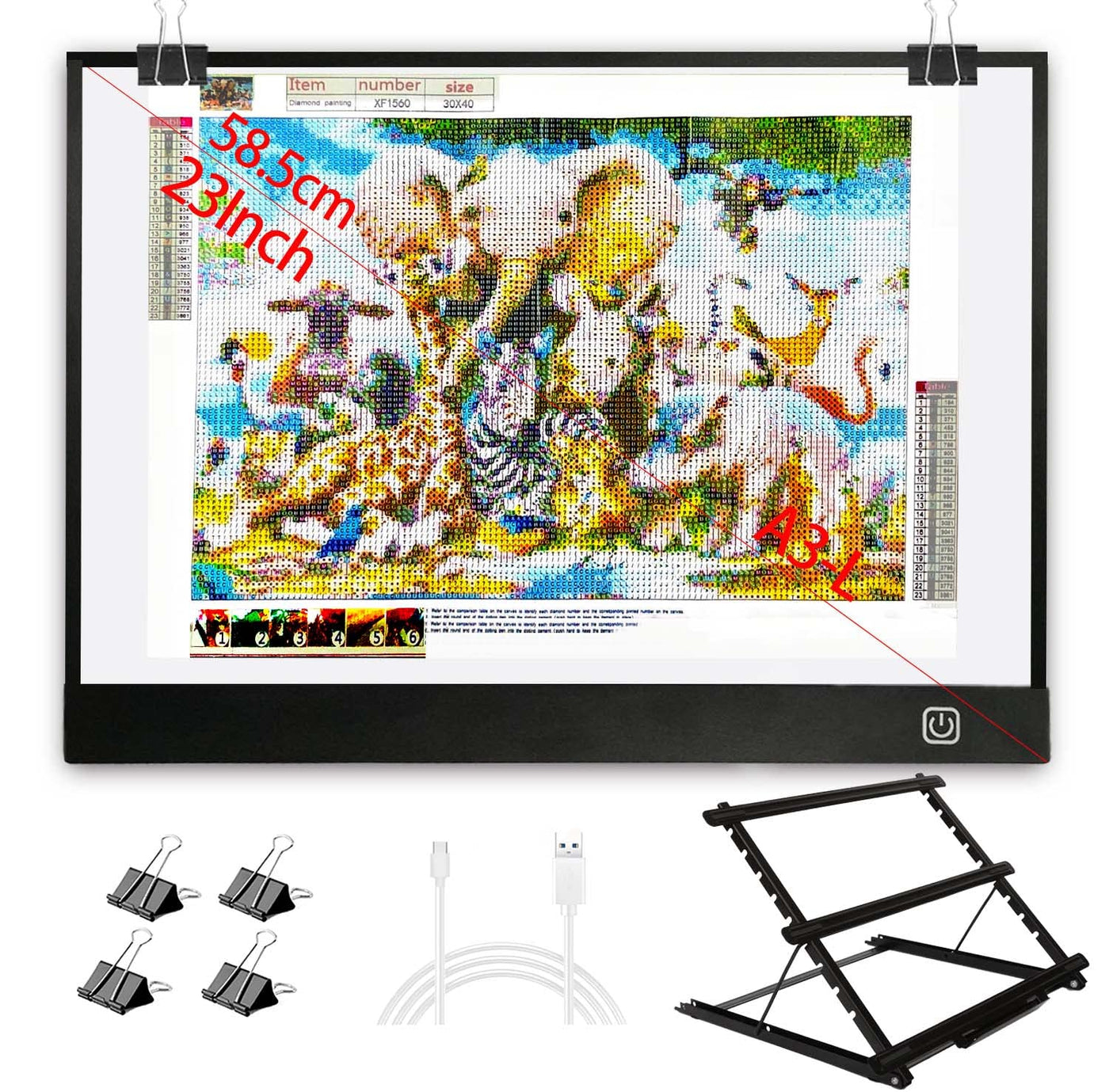Welzk Diamond Painting&Nbsp;Light Board A3, Born For The Hobby Of Diamond Art: Large Diamond Painting Light Board&Nbsp;A3: L:18.5Inchs &Nbsp;W:13.6Inchs &Nbsp;H:0.2Inchs,You Can Put The Entire Large Diamond Canvas Flat On The Light Board To Facilitate Your Diamond Art Works. With Large Metal Stand: &Nbsp;L:13.4 W:11.4Inch, With 9-Level Angle Adjustable, Use12 High-Cost Silicone Anti-Skid Pads, Sturdy And Not Shaking, It Can Also Perfect Used As A Laptop Stand. Convenient Powered:&Nbsp; Daily Use Of Mobile Phone Charger, Pc Usb Ports, Or&Nbsp;Power Banks, Each&Nbsp;One Can Provide Power Well For The Diamond Painting Light Board. Usb-C Interface: The Diamond Art Board Will Have A Longer Lifespan Compared To Micro Usb. No Annoying Side Lightemission Around &Amp;Eye Protection: The Diamond Painting&Nbsp;Light Box Use Snon-Flicker Leds To Make The Eyes Less Fatigued After Long-Hour Use. &Nbsp;A Great Choice For Gifts, Such As:&Nbsp; Birthday Gifts, Father'S Day Gifts, Mother'S Dayg Ifts,Thanksgiving Gifts, Christmas Gifts, Etc Recommended Scenarios:&Nbsp; Welzk A3 Light Board Born For Diamond Painting, Highly Recommended For Use In Diamond&Nbsp; Art&Nbsp; Scenes. &Nbsp; Package Content: 1X A3&Nbsp;Light Pad (L:18.5 &Nbsp;W:13.6Inchs) 1 X Large Metal Stand(&Nbsp;L:13.4 W:11.4Inchs) 1X Usb C Cable&Nbsp;(59Inch) 4X&Nbsp;Fixing Clips 1X Manual