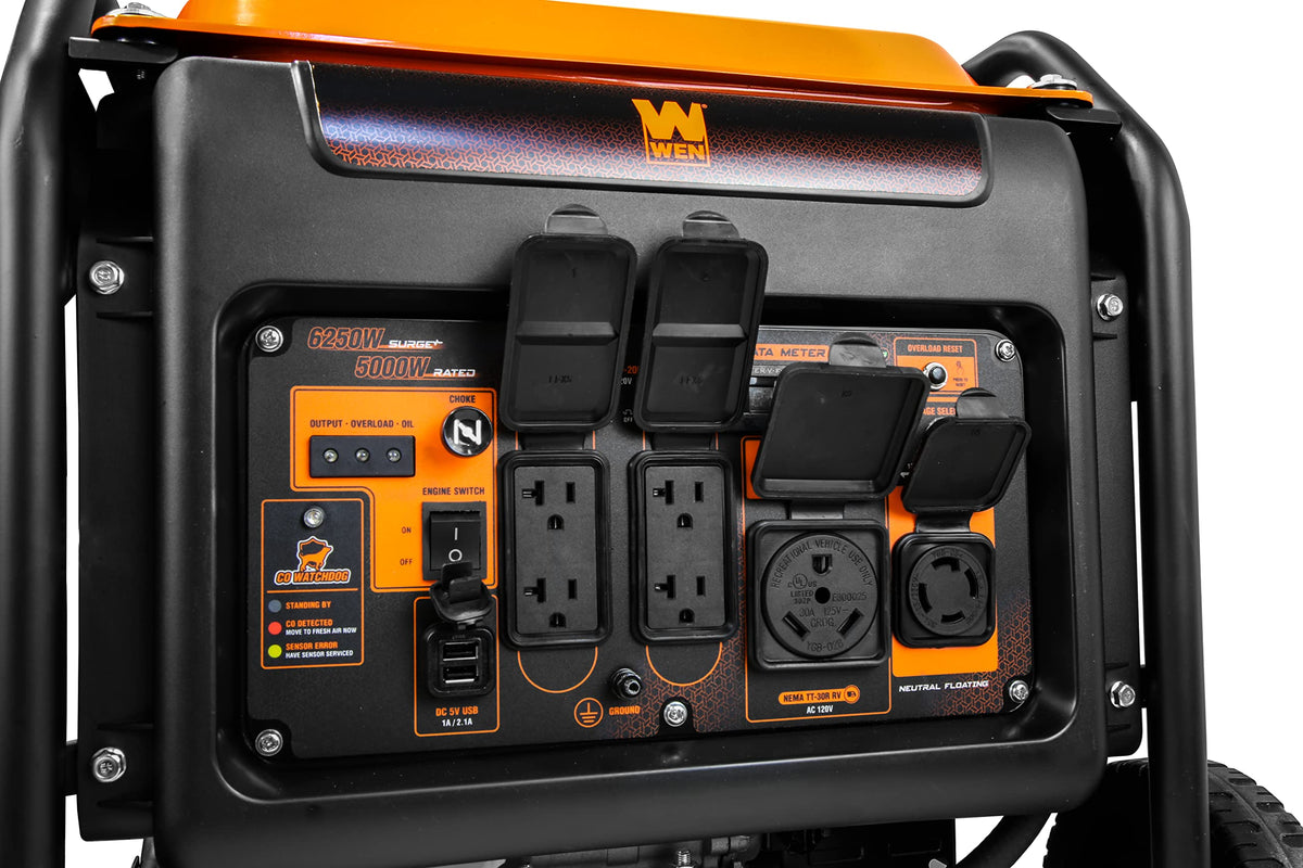 Remember When You Kept The Lights On? Keep Your Family Safe During Power Outages And Natural Disasters With The Wen Wen 6,250-Watt Rv And Transfer-Switch Ready Inverter Generator With Automatic Co Shutdown Sensor. The Included Inverter Provides Clean Energy, Free Of Voltage Spikes And Drops. Our 301Cc 4-Stroke Ohv Engine Produces Up To 6250 Surge Watts And 5000 Rated Watts Of Power, Making This The Perfect Backup Generator In Case Of Emergencies. Designed To Mirror A Pure Sine Wave, This Unit Limits Total Harmonic Distortion To Under 0.5 Percent At No Load And Under 1.5 Percent At Full Load, Making It Safe To Run Laptops, Cellphones, Monitors, Tablets And Other Sensitive Electronics. Our Ultra-Efficient 4.2-Gallon Tank Provides Up To 8.1 Hours Of Half-Load Run Time. The Wen Watchdog Co Shutdown Sensor Helps Protect Both You And Your Family By Automatically Turning Off The Generator If Dangerous Levels Of Carbon Monoxide Are Detected. Our Fully-Packed Panel Comes Equipped With Two Three-Prong 120V Nema 5-20R Receptacles, Two 5V Usb Ports, One 120V/240V Transfer-Switch-Ready Nema L14-30R Twist Lock Receptacle, And One 120V Rv-Ready Tt-30R Receptacle. Maximize Fuel Economy And Runtime By Engaging The Eco-Mode Switch. This Allows The Generators Engine To Automatically Adjust Its Fuel Consumption As Items Are Plugged Into And Unplugged From The Panel, Minimizing Noise And Fuel Usage Whenever Possible. The Lightweight Body Weighs 30% Less Than A Traditional 6250-Watt Generator, While The Included Wheel And Handle Kit Makes For Easy Transport And Storage Between Uses. The Panels Data Meter Monitors The Voltage, Frequency, Total Runtime, And Session Runtime. Low-Oil Shutdown, Combined With The Built-In Overload Protection And Indicator Lights, Safeguard Both Your Generator And Your Electronics From Damage. And Because Its A Wen Product, Your Open Frame Inverter Generator Comes Backed By A Two-Year Warranty, A Nationwide Network Of Skilled Service Technicians, And A Friendly Customer Help Line, All To Make Sure You Remember Wen.