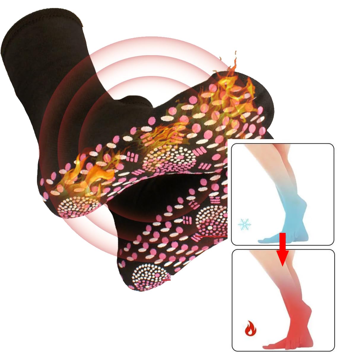 Tourmaline Thermal Circulation Self-Heating Shaping Socks: The Tourmaline Acupressure Self-Heating Shaping Socks Are Massaged By Stimulating Foot Acupuncture Points To Promote Blood Circulation, Eliminate Fatigue And Relax The Body.Acupressure The Foot And Calf Muscles, Keeping The Feet Warm At All Times, So That The Feet Are No Longer Cold And Stiff In Winter. Humanized Foot Fit Design: Fit The Curve Of The Foot, So That The Hair Hot Spot Close To The Skin Of The Palm Of The Foot, Soft And Comfortable.Tip: When Use The Foot Massage Sock, The Colored Dotted Side Should Be Placed Against The Bottom Of The Foot, Can Be Washed, But Can Not Be Soaked For A Long Time.Application: Our Self-Heating Socks Are Ideal For Skiing, Snowboarding, Hiking, Climbing, Jogging And Other Sports In Winter,You Can Also Use It As Anti Slip Non Slip Socks.