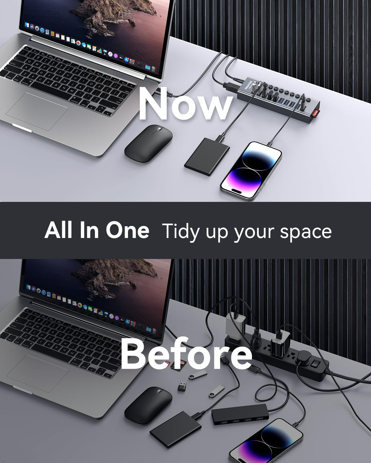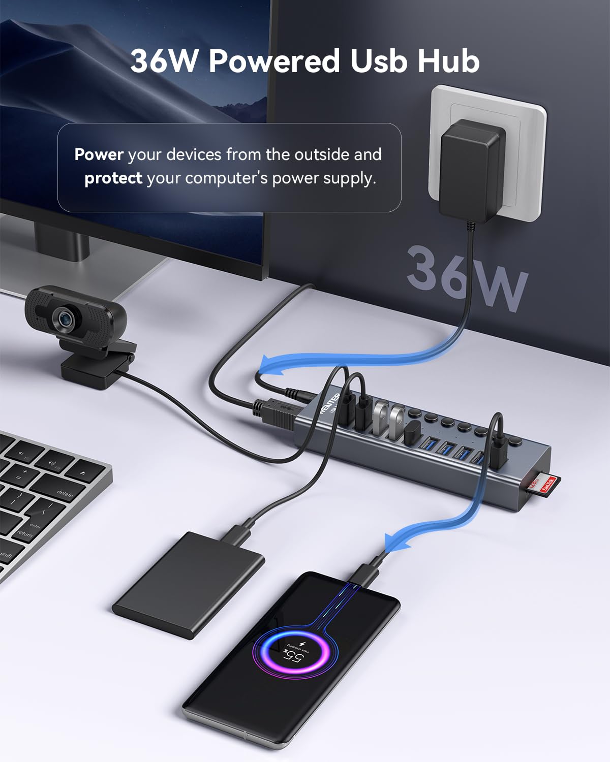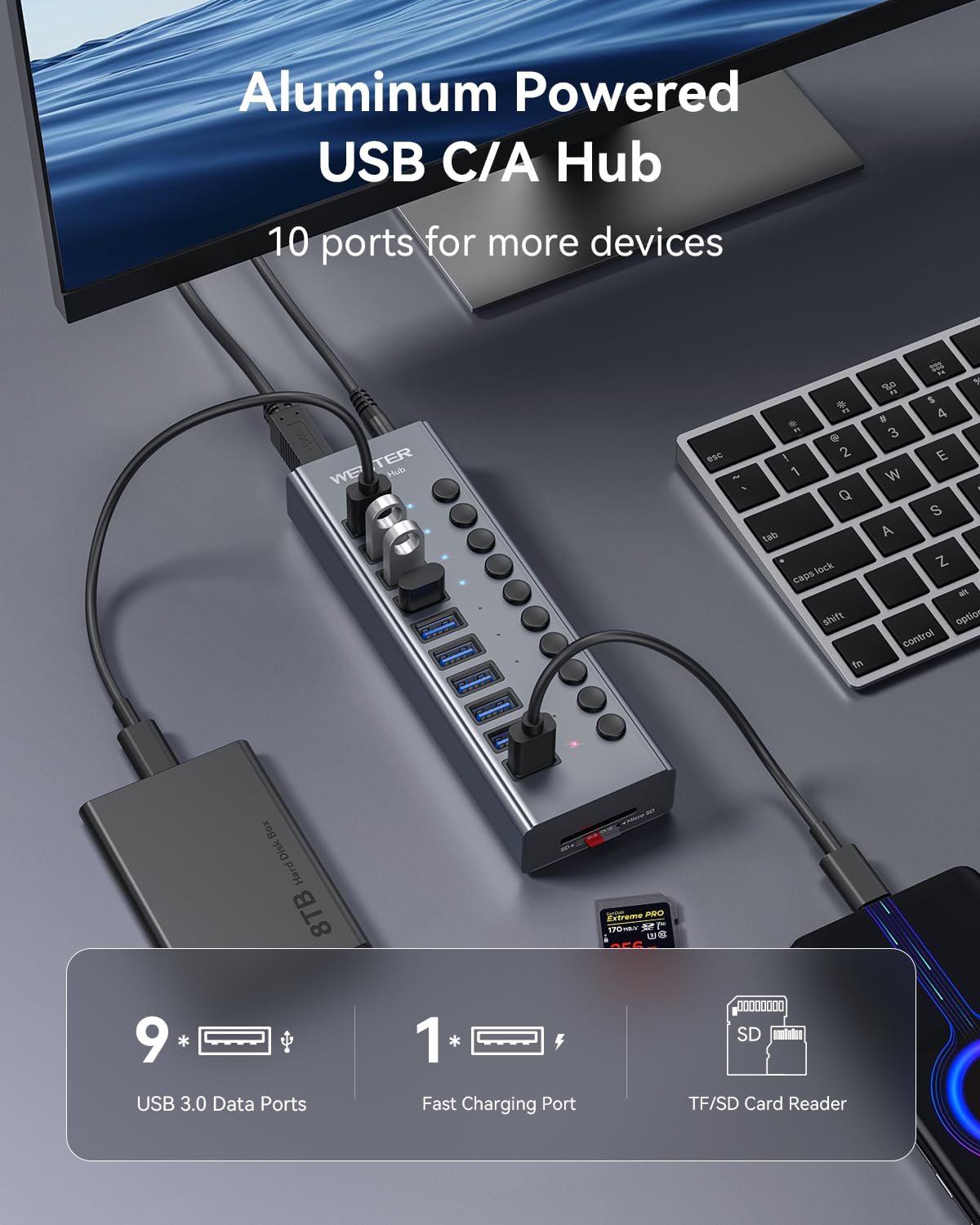 Wenter Powered Usb Hub 3.0 With Sd/Tf Card Reader, Aluminum 10 Port Powered Usb Hub (9 Usb 3.0 Data Transfer Port & 1 Usb Fast Charging Port Hub) Usb 3.0 Hub For Pc, Laptop