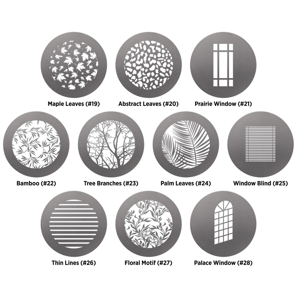 Designed By Lindsay Adler, This 10-Pack Of Environmental Gobos Pair With The Westcott Optical Spot For Projecting Focusable Images Or Patterns Of Light Onto Any Surface Or Subject. These 2.6 (6.6Cm) Metal Discs With Pattern Cutouts Are Ideal For Creating, Dramatic Special Effects, Subtle Textures, And Creative Patterns With Precise Focusing And Control. This Unique Gobo Pack For The Westcott Optical Spot Allows You To Create Organic Shapes Found In Nature Or Mimic Shadows From A Window. Ten Gobo Patterns Are Included: Maple Leaves, Abstract Leaves, Prairie Window, Bamboo, Tree Branches, Palm Leaves, Window Blinds, Thin Lines, Floral Motif, And Palace Window. When Paired With The Westcott Optical Spot, These Gobos Can Be Combined With Gel Filters To Add Color For Additional Creative Options. You Can Also Adjust The Focus Of Each Gobo Light Pattern And Use The Spots Metal Leaves For Precise Selective Patterns.