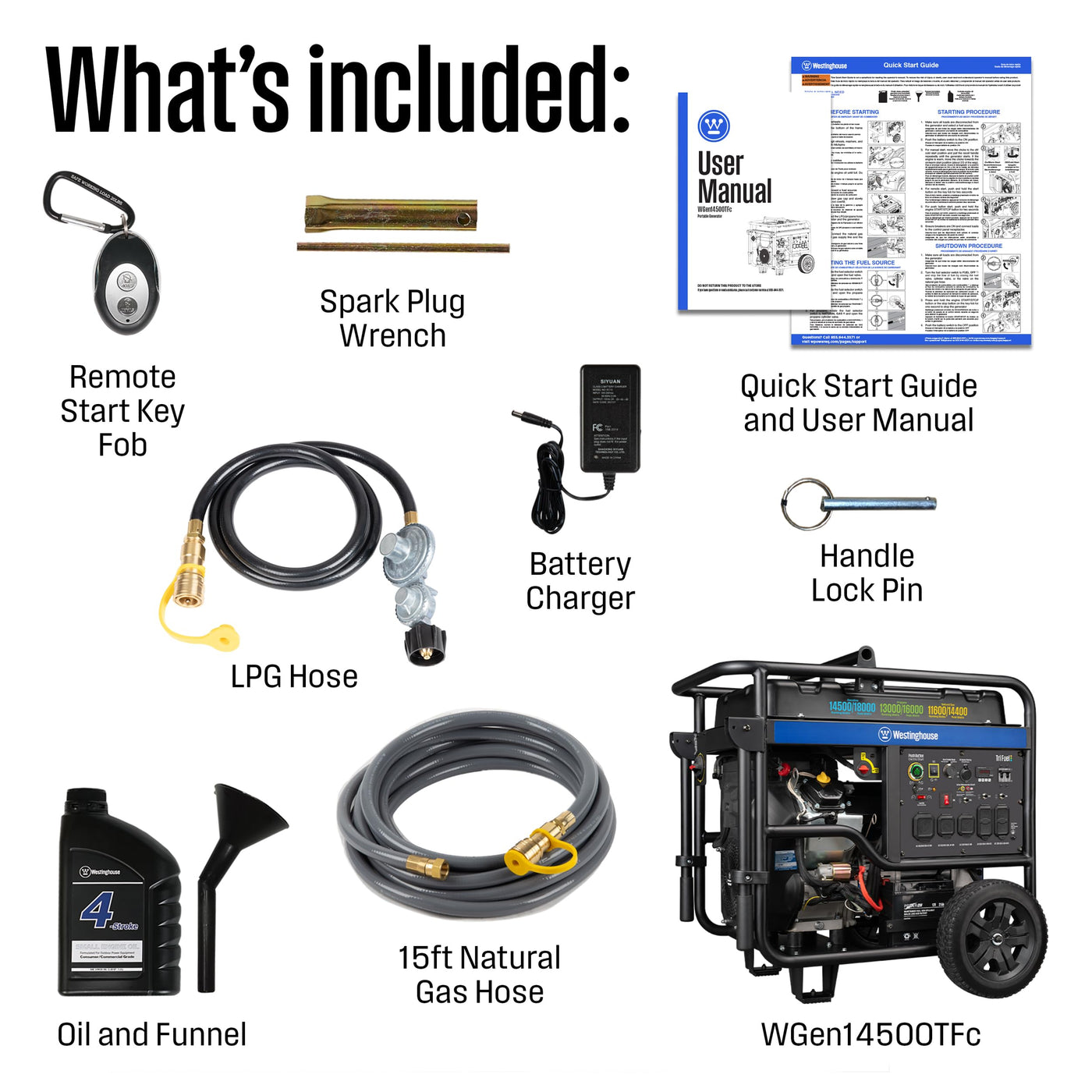 Q: Does the Westinghouse generator come with a remote start feature?A: Yes, the WGen14500TFc features both electric start and remote start capabilities, complete with an included key fob for added convenience.