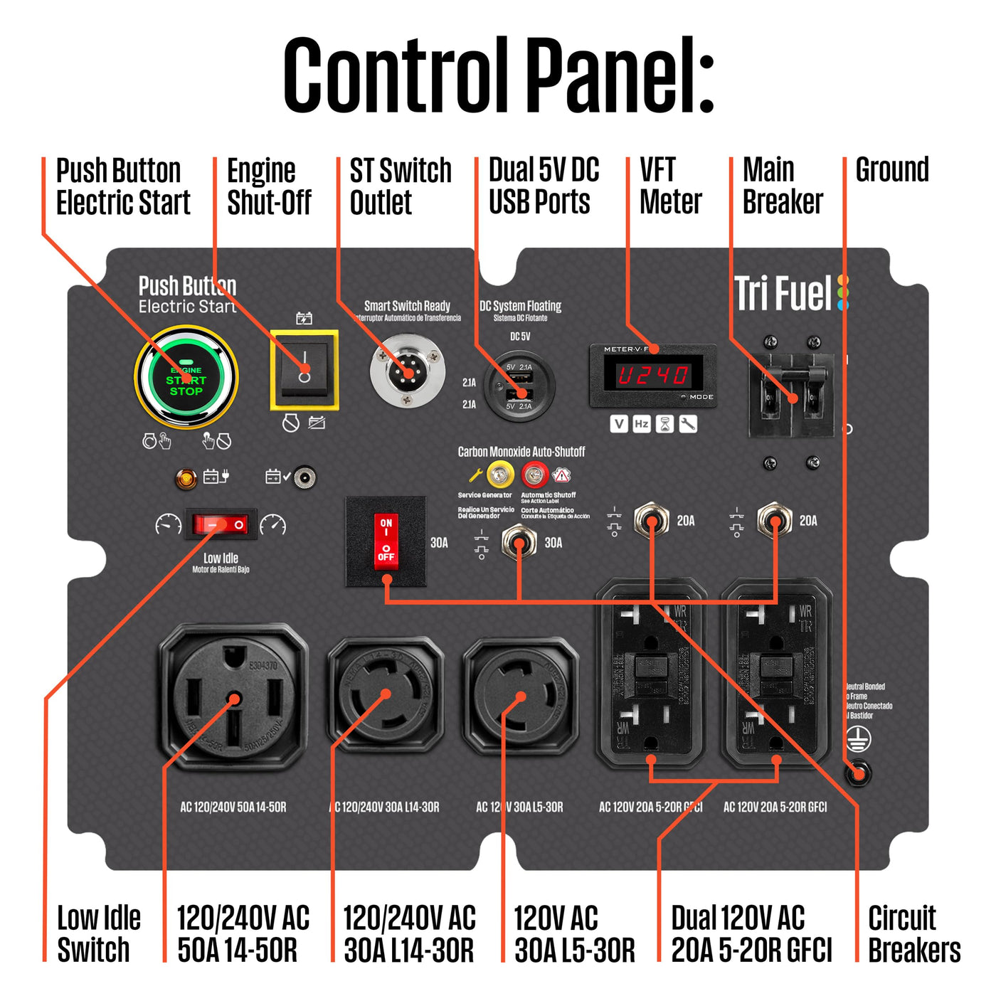 The Westinghouse Wgen14500Tfc Tri-Fuel Portable Generator With Co Sensor Produces Up To 18,000 Peak Watts And 14,500 Running Watts, The Wgen14500Tfc Is A Tri Fuel Generator That Operates On Gasoline, Propane (Lpg), Or Natural Gas. The Heavy Duty 713Cc 4-Stroke Ohv Westinghouse Engine Is Constructed Of A Durable Cast Iron Sleeve And Runs For Up To 12 Hours On A 10.5 Gallon (36 L) Gas Tank, Keeping You Powered Through The Day With Built-In Fuel Gauge, Automatic Low Oil Shutdown, And Gfci Outlets. Push-Button Electric Start Makes Starting The Wgen14500Tfc Effortless While The Remote Start Key Fob Offers Added Ease From A Distance. Its Intuitive Control Panel Spotlights The Transfer Switch Ready L14-30R And Larger 14-50R To Power Your Major Appliances Like The Air Conditioner, Refrigerator, And Sump Pump As Well As Any Lights Or Entertainment Centers All At The Same Time With A Single Cord Hookup. Vft Data Center Displays Volt Output, Frequency, And Lifetime Hours To Keep You Up To Date With Real-Time Information And Regular Maintenance. Conveniently Portable With An Included Set Of Heavy Duty Never-Flat Wheels, Handle, And Lift Bracket, It'Ll Have Your House, Travel Trailer, Or Jobsite Powered In Seconds. The Wgen14500Tfc Is Complete With A 3-Year Limited Warranty And Lifetime Technical Support Backed By Our Nationwide Customer Service And Support Network.