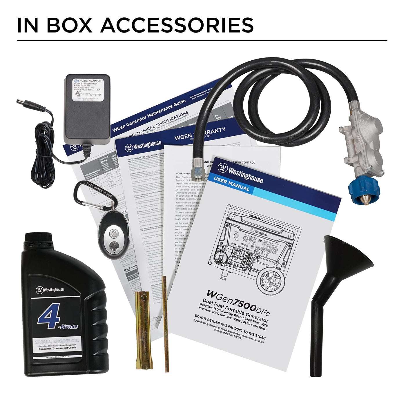The Westinghouse Wgen7500Dfc Dual Fuel Portable Generator With Co Sensor Is A Powerful Solution To Staying Prepared For Emergency Events. It Produces Up To 9,500 Peak Watts And 7,500 Running Watts, Running For Up To 11 Hours On A 6.6 Gal. (25 L) Gasoline Fuel Tank. Forged With A Cast Iron Sleeve, The Wgen7500Dfc Has A 420Cc 4-Stroke Ohv Westinghouse Engine Constructed For Durability. It'S Equipped With A Built-In Fuel Gauge, Automatic Low Oil Shutdown, And Gfci Household Outlets For Added Protection. The Wgen7500Dfc Features Push-Button Electric Start Which Conveniently Pairs With A Wireless Remote Key Fob For Effortless Ignition, And As A Dual Fuel Generator, The Wgen7500Dfc Operates On Gasoline Or Propane (Lpg) For Versatility. The L14-30R Outlet Is Transfer Switch Ready, Connecting Straight To Your Home For Total Household Power And Eliminating The Hassle For Annoying Extension Cords Or Power Strips. The Wgen7500Dfc Is Easy To Care For With A Vft Data Center To Share Real-Time Updates On Maintenance Information, Ensuring Long Life And Lasting Utility. A Hardened-Steel Frame With Added Roll Bars, Foam Grip Handle, And Never-Flat Wheels Lets You Easily Transport This Generator On The Go. The Wgen7500Dfc Is Complete With A 3-Year Limited Warranty And Lifetime Technical Support Backed By Our Nationwide Customer Service And Support Network.