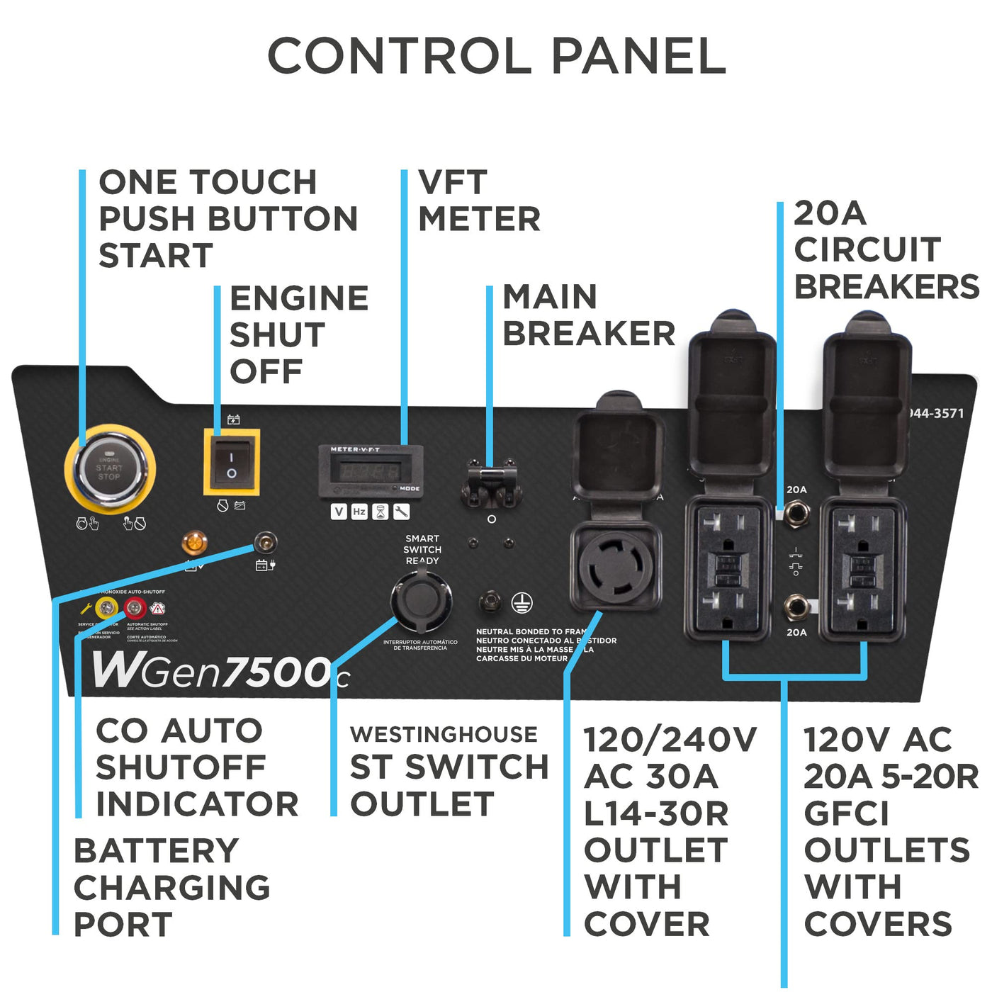 The Westinghouse Wgen7500C Portable Generator With Co Sensor Is A Powerful And Easy-To-Use Power Source To Keep Your Home Prepared For Emergency Events. It Produces 9,500 Peak Watts And 7,500 Running Watts, Operating For Up To 11 Hours On A 6.6 Gal. (25 L) Gasoline Fuel Tank. The Wgen7500C Features Push-Button Electric Start, Conveniently Pairing With A Wireless Remote Key Fob For Effortless Ignition. Forged With A Cast Iron Sleeve, The Wgen7500C Has A 420Cc 4-Stroke Ohv Westinghouse Engine Constructed For Durability. It'S Equipped With A Built-In Fuel Gauge, Automatic Low Oil Shutdown, And Gfci Household Outlets For Added Protection. The L14-30R Outlet Is Transfer Switch Ready, Connecting Straight To Your Home For Total Household Power And Eliminating The Hassle For Annoying Extension Cords Or Power Strips. The Wgen7500C Is Easy To Care For With A Vft Data Center To Share Real-Time Updates On Maintenance Information, Ensuring Long Life And Lasting Utility. A Hardened-Steel Frame With Added Roll Bars, Foam Grip Handle, And Never-Flat Wheels Lets You Easily Transport This Generator On The Go While Rubber Outlet Covers Provide Added Protection From The Environment. The Wgen7500C Is Complete With A 3-Year Limited Warranty And Lifetime Technical Support Backed By Our Nationwide Customer Service And Support Network.