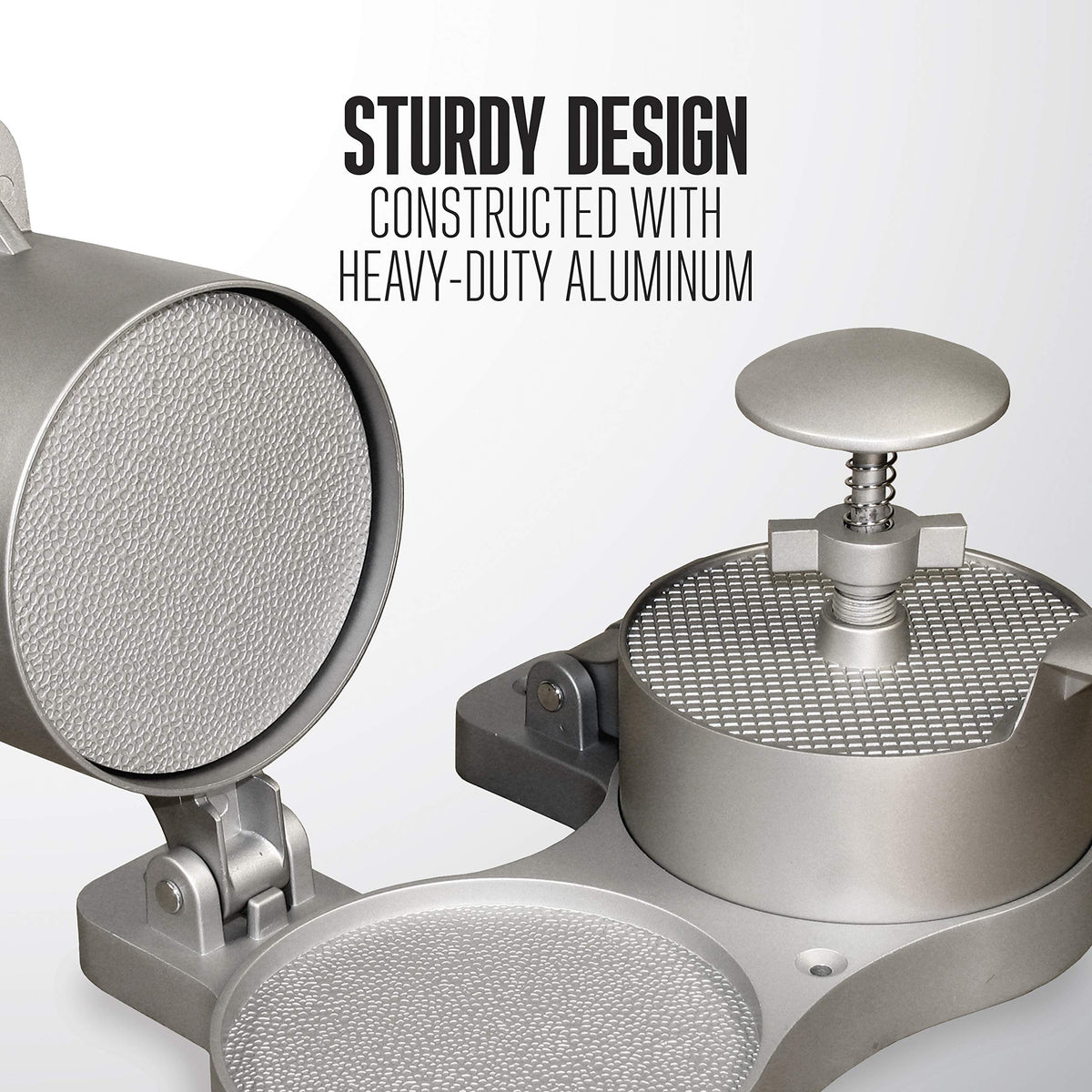 Press Two Burgers At Once With The Double Burger Press. Exclusive Spring Plunger Makes Patty Pressing & Removal Effortless. Also Great For Making Stuffed Burgers, Crab Cakes & Sausage Patties.Spring Plunger For Easy Patty Removal. Adjustable Patty Thickness From '' To 1 ''. Patties Measure 4 '' In Diameter. Nonstick Coating. Cast Aluminum. Wipes Clean.