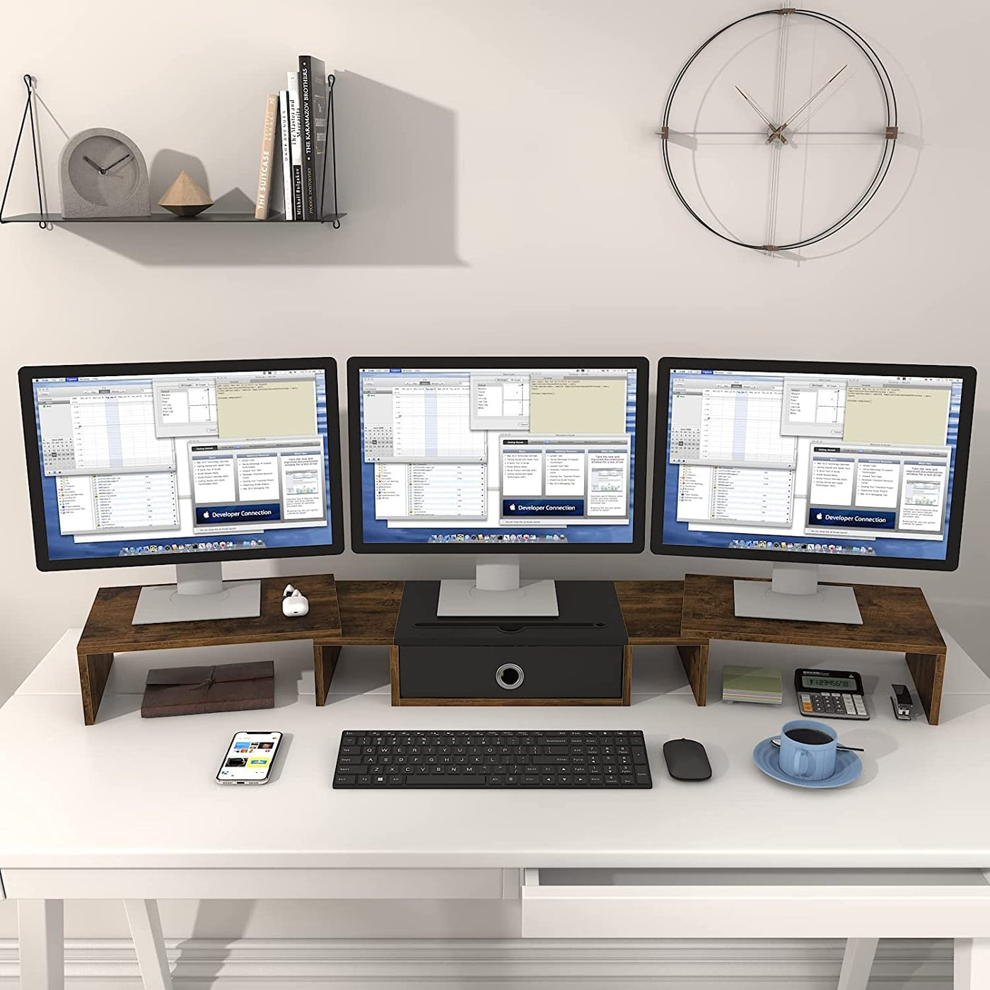 Westree Triple Monitor Stand Riser With Drawer,Dual Monitor Stand With Length And Angle Adjustable,Extra Large Desktop Organizer Riser For 1~2~3 Monitor Computer,Laptop,Printer,Tv
