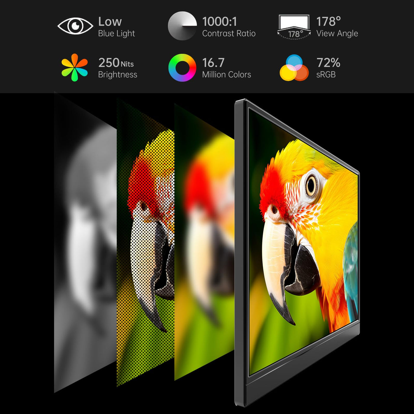 Q: What is the low blue light technology in the WGK Portable Monitor?A: The low blue light technology in the WGK Portable Monitor helps to reduce eye strain and fatigue during prolonged use, making it a comfortable choice for long working hours or gaming sessions.