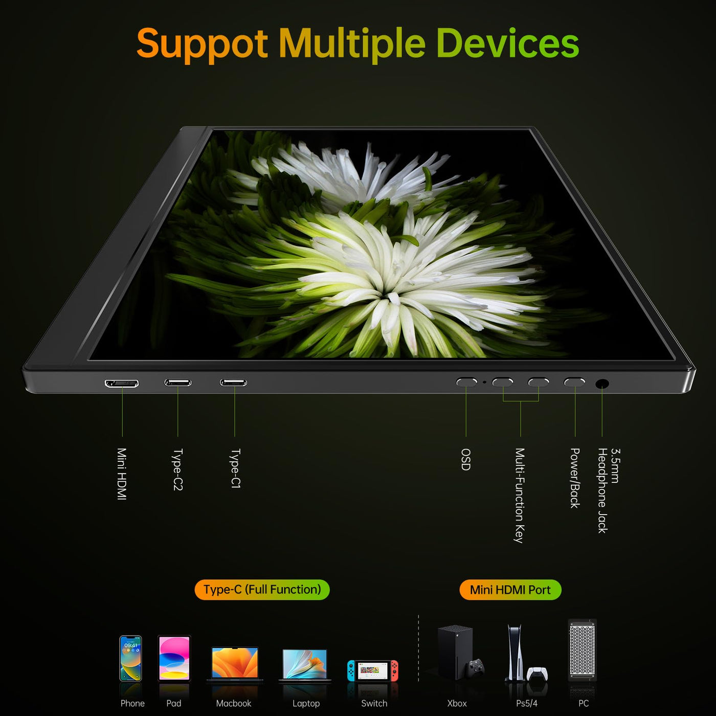 Q: What devices are compatible with the WGK Portable Monitor?A: The WGK Portable Monitor is compatible with a wide range of devices, including laptops, PCs, Mac computers, smartphones, and gaming consoles such as PS, Xbox, and Nintendo Switch. It features dual USB-C ports and a Mini HDMI port for easy connectivity.
