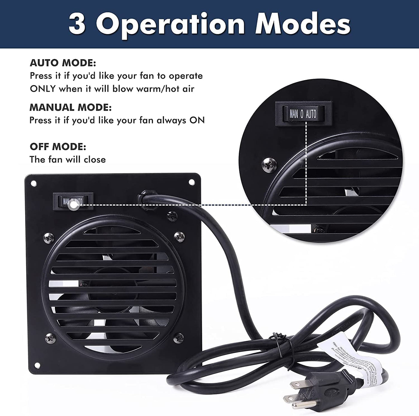 Q: Can the WHF100 Heater Fan operate manually?A: Yes, the WHF100 Heater Fan offers both automatic and manual operation modes. You can choose to manually control the fan or allow it to operate automatically based on the temperature of your heater.