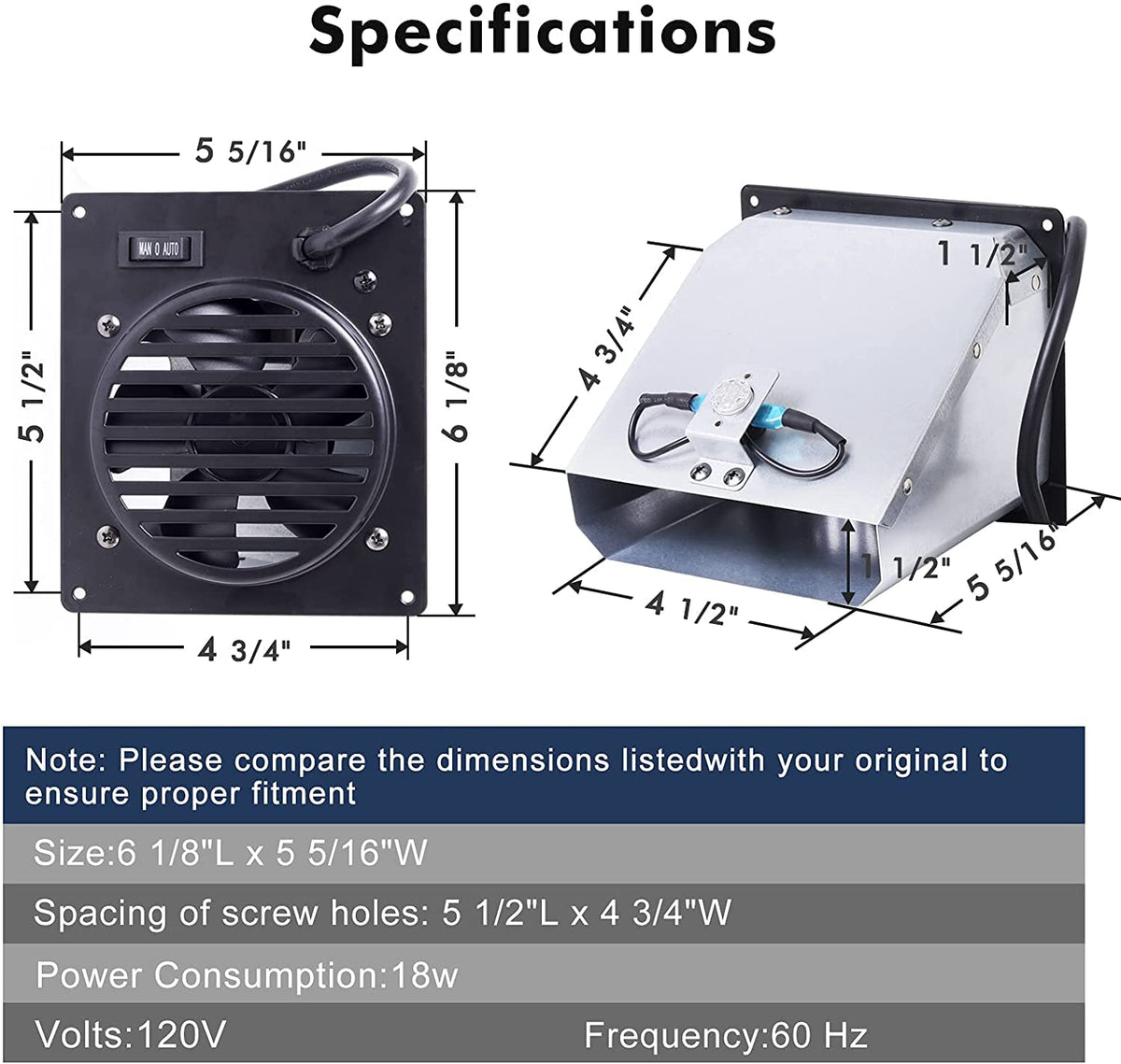 Q: What are the dimensions of the WHF100 Heater Fan?A: The WHF100 Heater Fan measures 6 1/8 inches in length and 5 5/16 inches in width. The spacing of the screw holes is 5 1/2 inches by 4 3/4 inches, allowing for easy installation.
