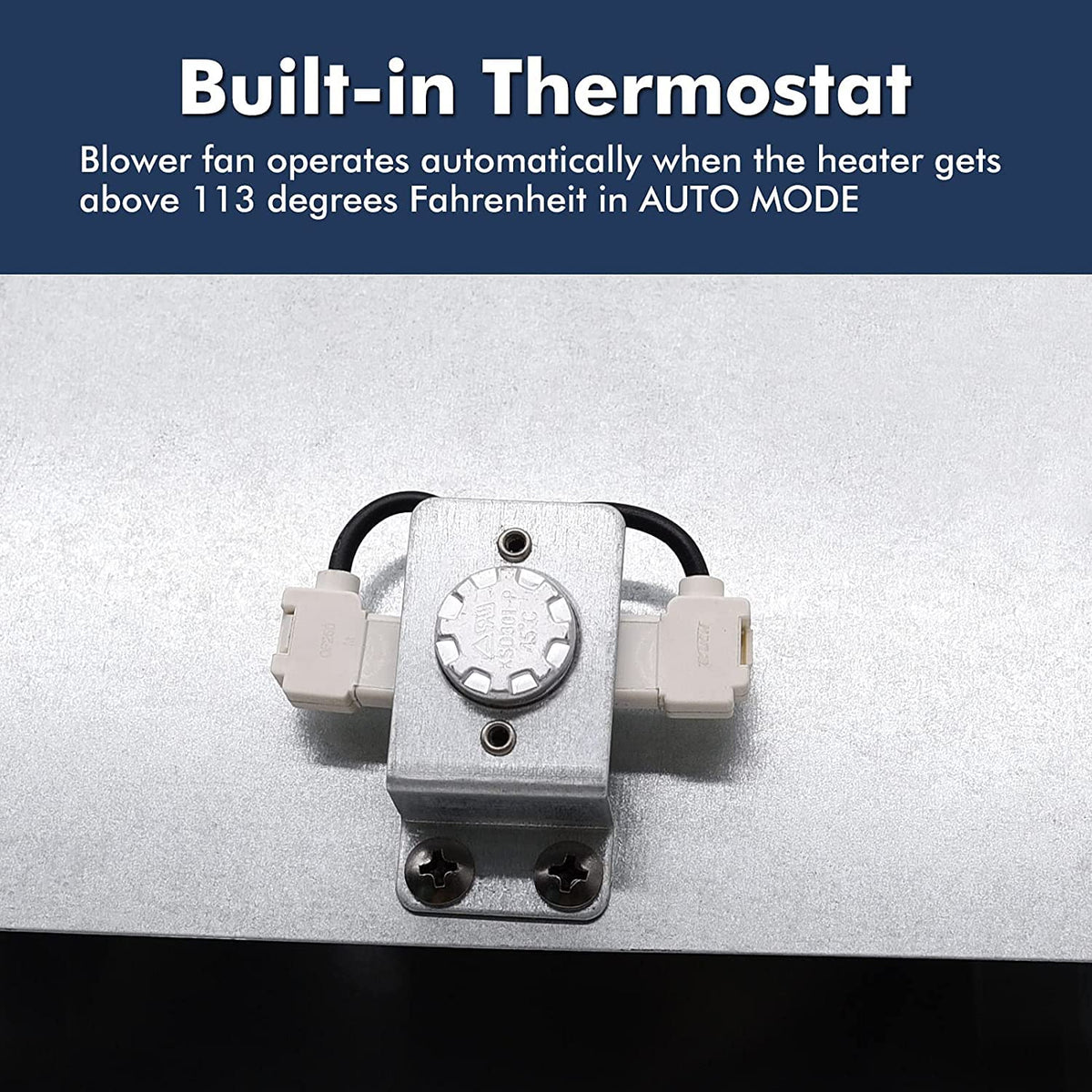 Q: How does the built-in thermostat work in the WHF100 Heater Fan?A: The built-in thermostat in the WHF100 Heater Fan automatically activates the fan when the heater's temperature exceeds 113 degrees Fahrenheit. This ensures that the fan blows warm air only, improving the overall heat distribution in your space.
