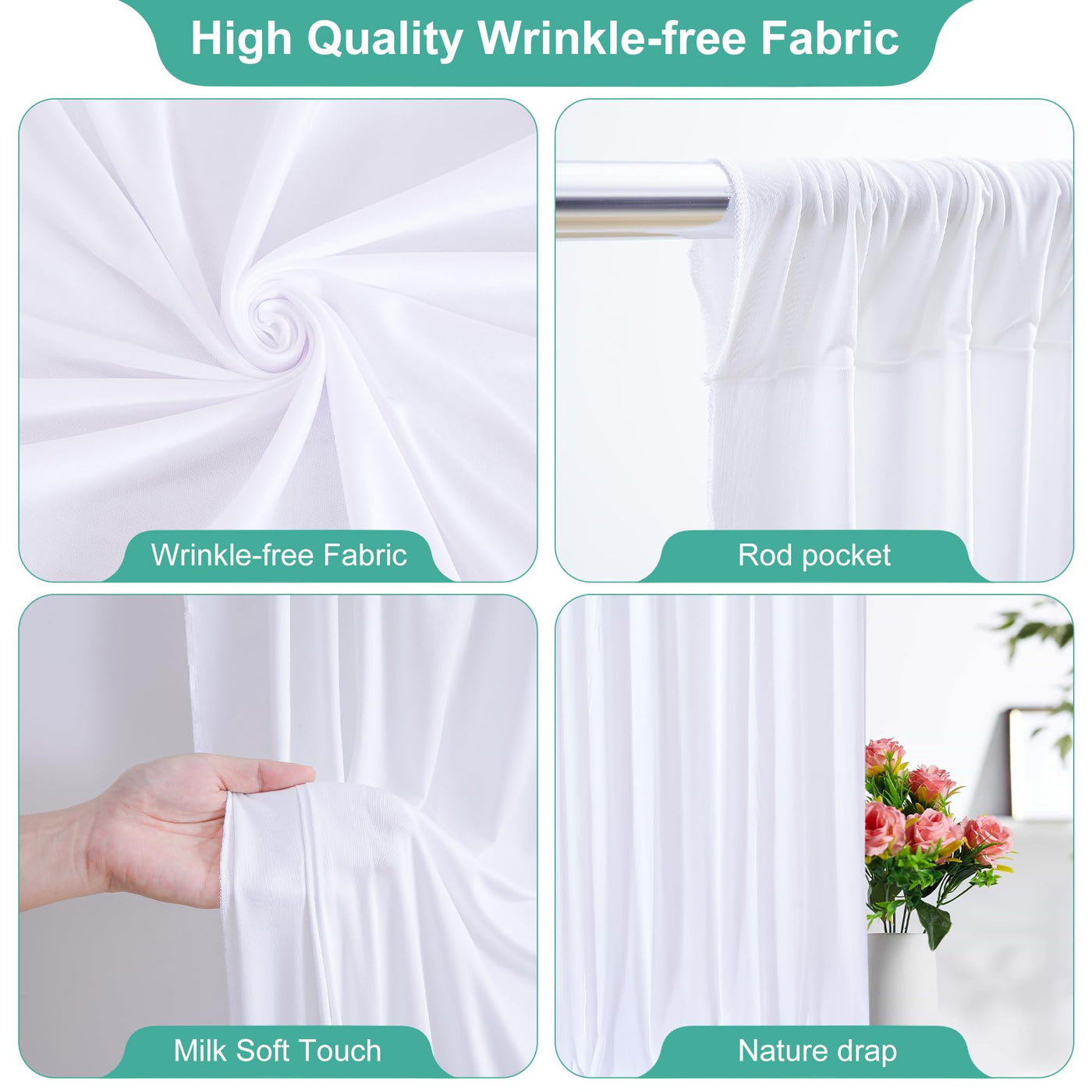 Q: What materials are the backdrop curtains made of?A: The backdrop curtains are made of soft polyester fabric, which is sturdy, anti-wrinkle, and has a good vertical sense, making them ideal for various events and photography.