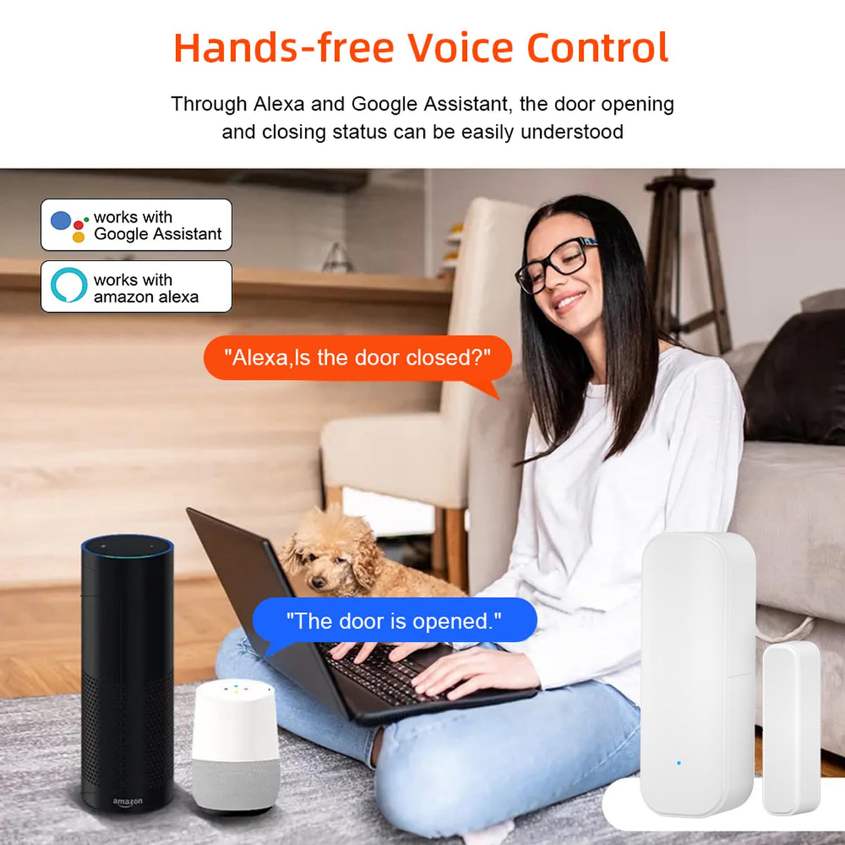 Q: Is the WiFi Door Sensor compatible with smart home systems?A: Yes, the WiFi Door Sensor is compatible with Amazon Alexa and Google Assistant. You can control it using the 'Tuya Smart' or 'Smart Life' app, allowing for seamless integration into your existing smart home system.