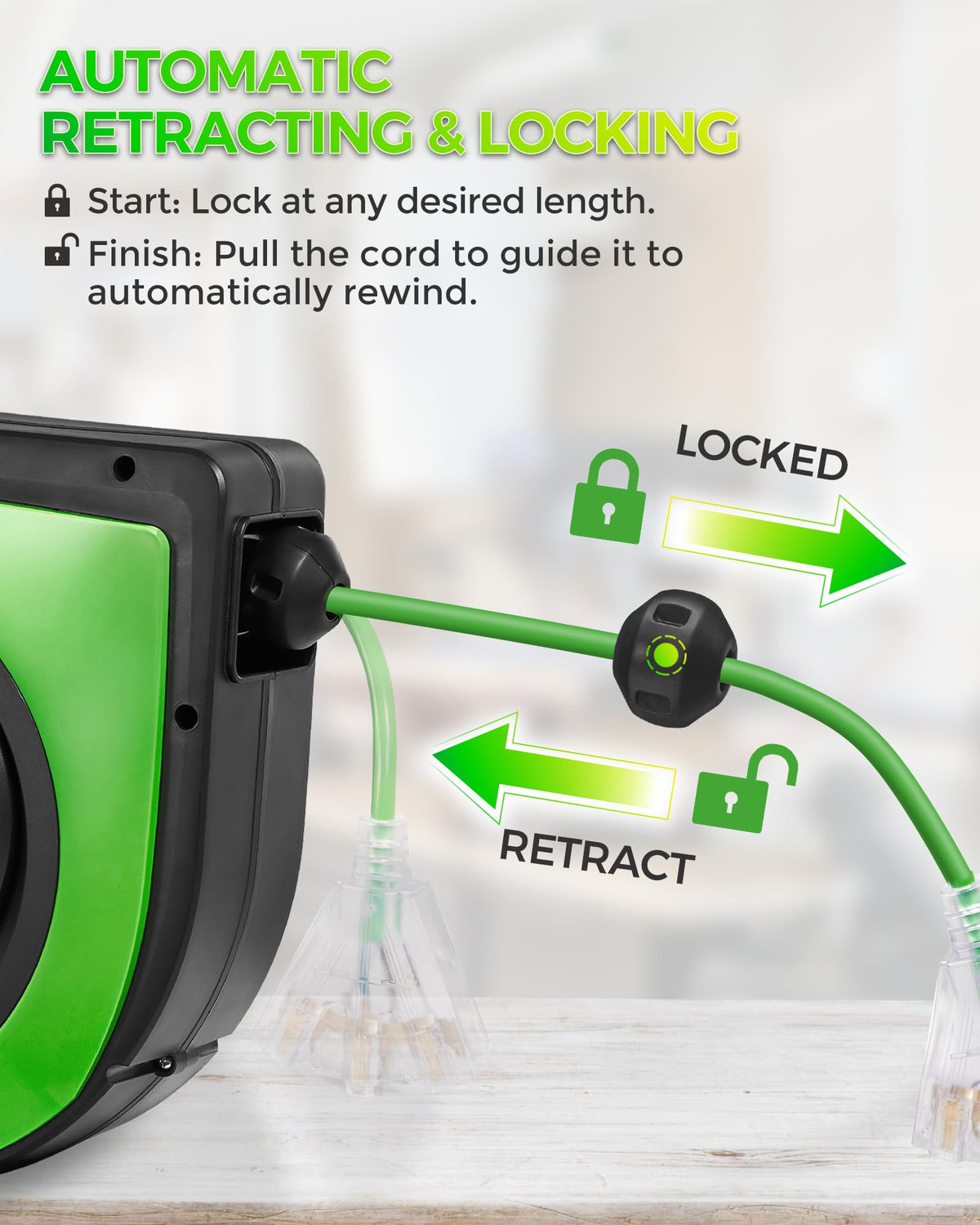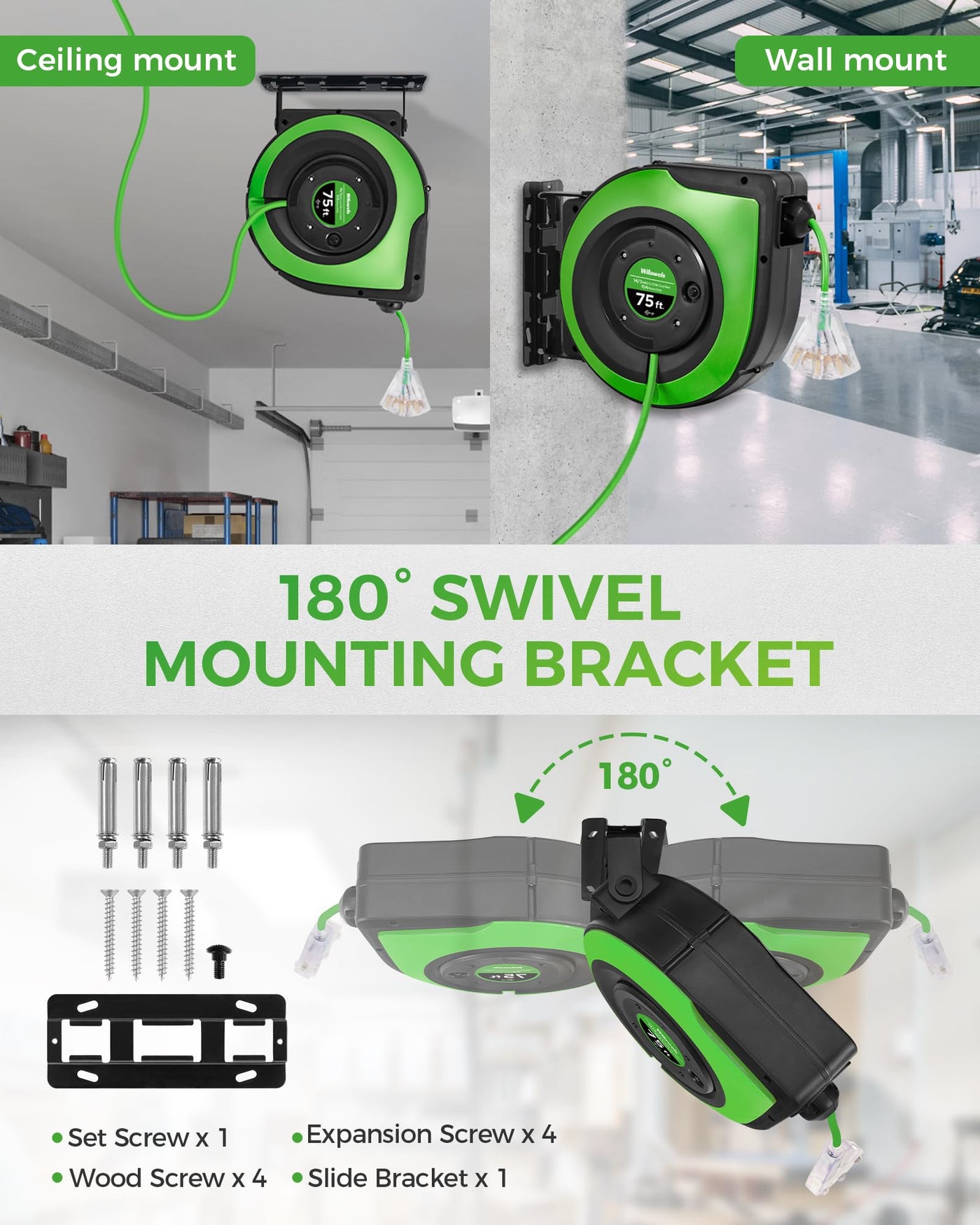 Wilawels Retractable Extension Cord Reel Powers Your Devices Anywhere! Tired Of Messy Cords Around? Use Wilawels Retractable Reel For Easy Cord Management. This Cord Reel Includes A 75Ft Extension Cord And A 4.5Ft Lead-In Cord, Making It Perfect For Use In Shops, Garages, Construction Sites And Homes. It Is Ideal For Pressure Cleaning, Landscaping Maintenance, Vehicle Maintenance And More. The Ratcheting Mechanism Allows For Easy Adjustment Of Cord Length, And A Gentle Pull Activates The Retraction System. The Built-In Circuit Breaker Automatically Cuts Off Power Supply When The Total Current Of Connected Equipment Exceeds 10A, Ensuring The Safety Of Both Equipment And Operators. This Heavy Duty Power Cord Is Ul Certified For High Reliability. Get Ready To Power Up And Take Control Of Your Space With Wilawels!