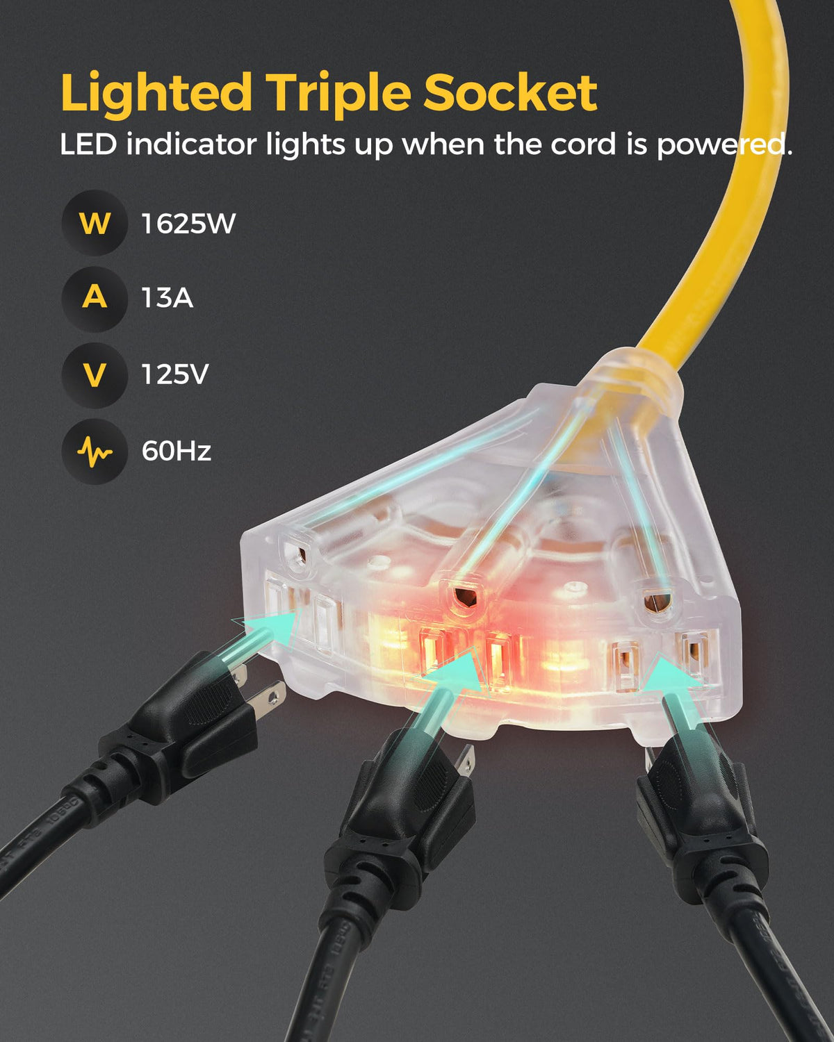 Wilawels Retractable Extension Cord Reel, 50 Ft Heavy Duty Power Cord, 14Awg/3C Sjtow, 3 Grounded Outlets Lighted Triple Tap, 13