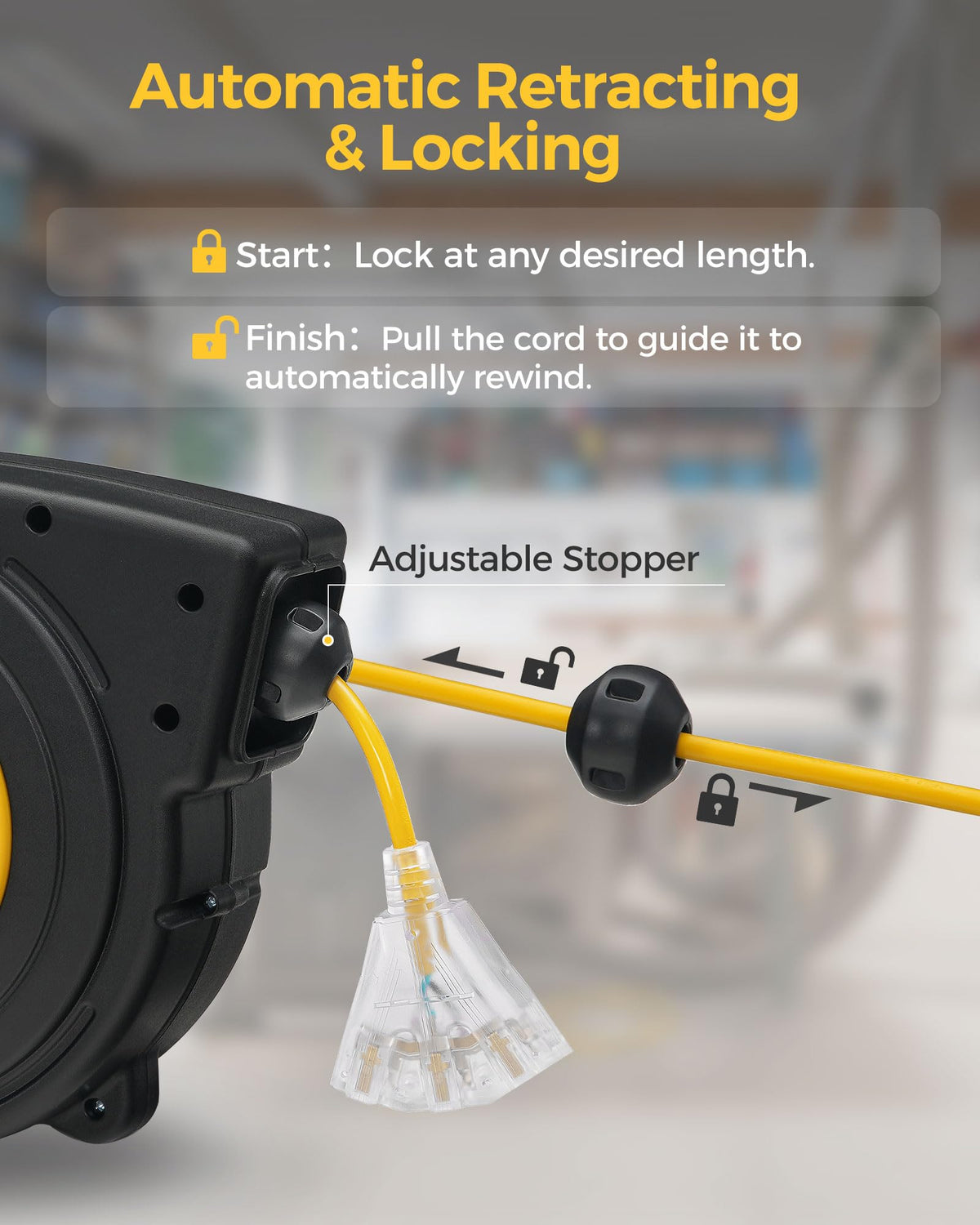 Wilawels Retractable Extension Cord Reel Powers Your Devices Anywhere! Tired Of Messy Cords Around? Use Wilawels Retractable Reel For Easy Cord Management. This Cord Reel Includes A 50Ft Extension Cord And A 4.5Ft Lead-In Cord, Making It Perfect For Use In Shops, Garages, Construction Sites And Homes. It Is Ideal For Pressure Cleaning, Landscaping Maintenance, Vehicle Maintenance And More. The Ratcheting Mechanism Allows For Easy Adjustment Of Cord Length, And A Gentle Pull Activates The Retraction System. The Built-In Circuit Breaker Automatically Cuts Off Power Supply When The Total Current Of Connected Equipment Exceeds 13A, Ensuring The Safety Of Both Equipment And Operators. This Heavy Duty Power Cord Is Ul Certified For High Reliability. Get Ready To Power Up And Take Control Of Your Space With Wilawels!