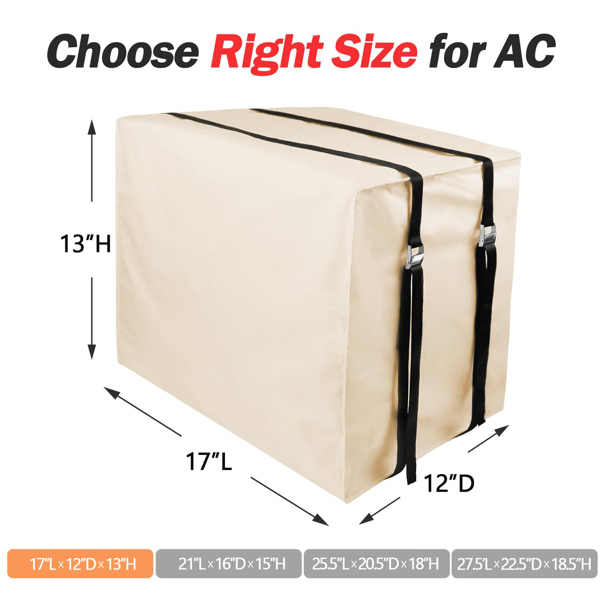 Q: How do I install the Window Air Conditioner Cover?A: Installation is simple; just place the cover over your air conditioner and secure it with the adjustable metal straps. Make sure to measure your unit (17"W x 13"H x 12"D) before purchase for the best fit.