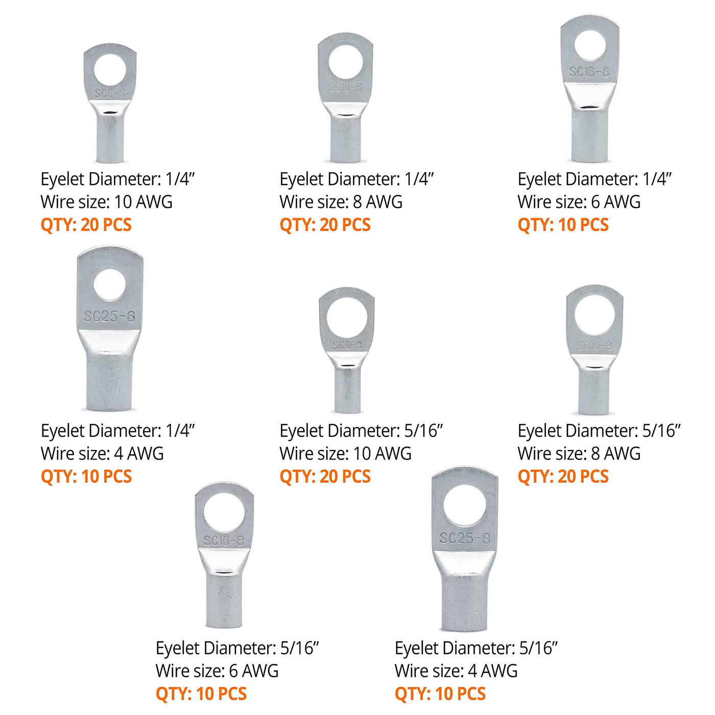 Wirefy Tinned Copper Terminal Lugs Work Great For Larger Wire Gauge Applications For Power Draw Or Grounding. Our Crimp Ring Terminal Lugs Are Used For Connecting Cables, Electrical Appliances And Other Power Applications. These Battery Cable Ends Can Be Either Crimped Or Soldered To Wire.Tinned Copper Wire Lugs Are Produced From High Conductivity Copper For Maximum Current Flow. A Thin Layer Of Tin Has Been Applied To Each Copper Lug To Protect The Terminal Against Corrosion Caused By Harsh Environments. The Inspection Hole Allows To Examine Your Connection To Ensure The Cable Has Been Fully Inserted Into The Terminal. Each Ring Terminal Has Been Marked With The Wire Gauge Index For Easy Identification.We Have Included The Most Popular Battery Lug Sizes In This Versatile Assortment. Ring Eyelets Can Be Easily Drilled, In Case You Need To Use Them With A Larger Stud Size.Wirefy 120 Pcs Tinned Copper Wire Lugs Assortment Includes:Wire Gauge:10 Awg; Eyelet Size: 1/4''- Qty: 20Wire Gauge:10 Awg; Eyelet Size: 5/16'' - Qty: 20 Wire Gauge:8 Awg; Eyelet Size: 1/4'' - Qty: 20 Wire Gauge:8 Awg; Eyelet Size: 5/16'' - Qty: 20 Wire Gauge:6 Awg; Eyelet Size: 1/4'' - Qty: 10 Wire Gauge:6 Awg; Eyelet Size: 5/16'' - Qty: 10 Wire Gauge:4 Awg; Eyelet Size: 1/4'' - Qty: 10Wire Gauge:4 Awg; Eyelet Size: 5/16'' - Qty: 10