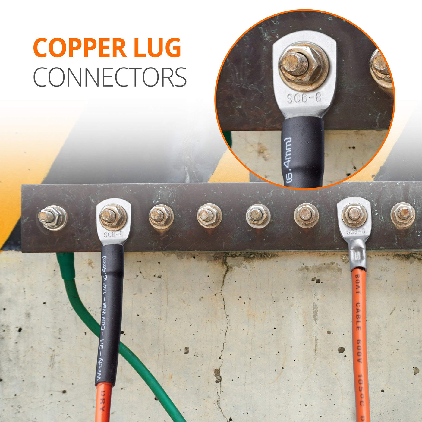 Q: What materials are the Wirefy battery lugs made from?A: These battery lugs are made from high-quality thick copper, which provides superior conductivity and strength for secure connections.