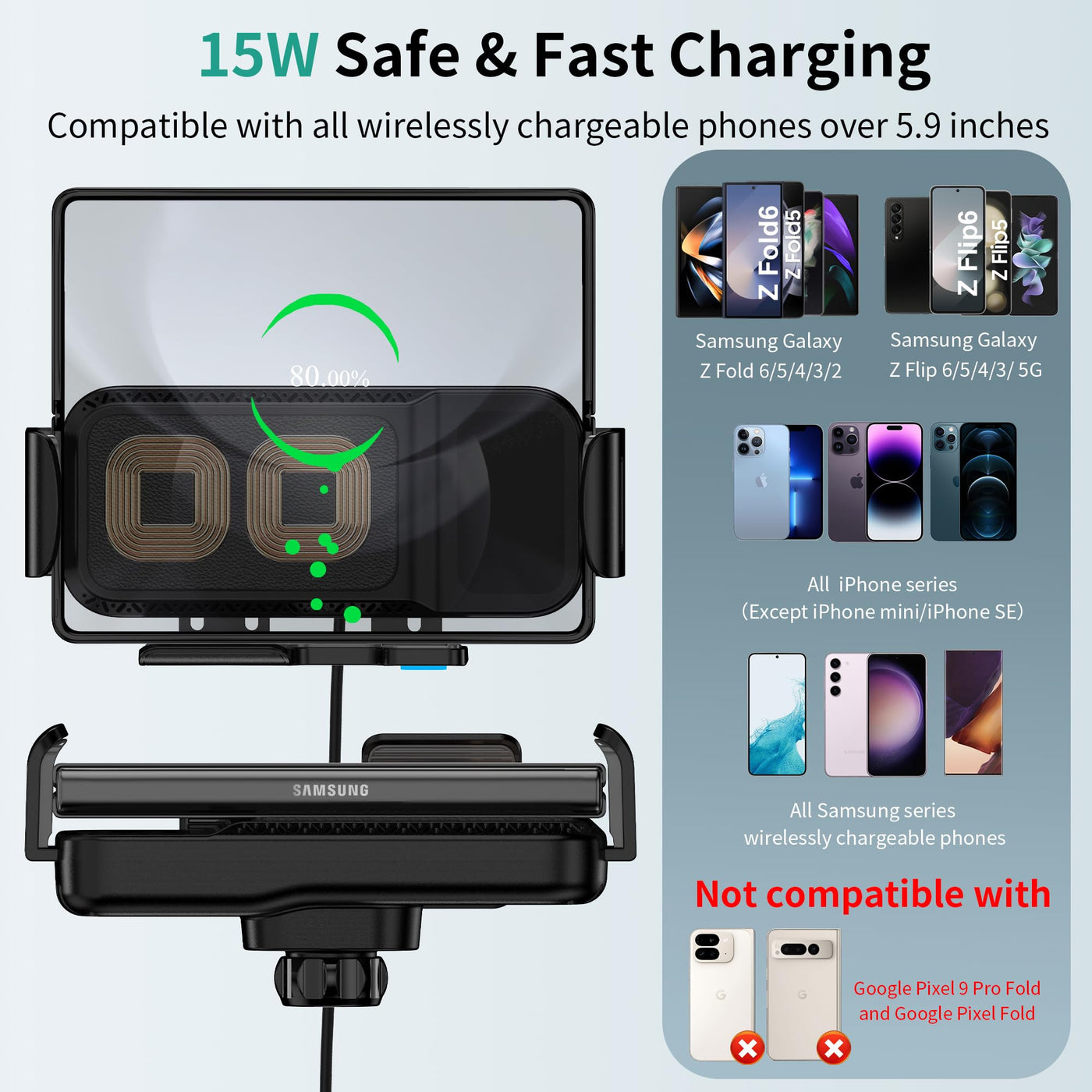 Wireless Car Charger Mount, 15W Dual Coil Rotatable Car Phone Holder Wireless Charger For Samsung Galaxy Z Fold 6/5/4/3/2, Z Fli