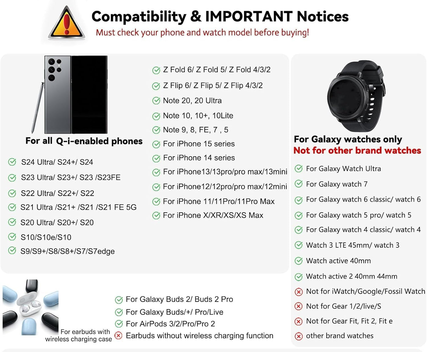 ?Why Choose Our Wireless Charger Stand? ? Customized For Your Device (Phone/Watch/Headphone). ? Equipped With Digital Clock Function That Other Old Wireless Charging Station Do Not Have. ? With User-Friendly Charging Indication, The Display Has Four Levels Of Brightness, Low, Medium, High And Off. ? Dual Charging Coils, Vertical And Horizontal Charging. ? Non-Slip Surface To Prevent Your Phone From Sliding. ? Fits The Case, Bu?0.2 Inches (5Mm)Thickness Is Recommended. ?Compatiblity ?Phone 1. Samsung: Galaxy S22,S22+,S22 Ultra,S21 Fe,S21,S21+,S21 Ultra,S20,S20 Ultra,S20Plus,10,9,Note 20, Note 10, Z Fold 3/Z Flip 3 2. Iphone: Iphone 13/13 Pro/13 Mini/13 Pro Max/Se 2022/12/12 Pro/12 Pro Max/12Mini/Se 2/11/11 Pro Max/Xs Max/Xs/Xr/X/8 3.Other Phones That Support Wireless Charging. ?Earbuds: 1. Samsung Galaxy Bud/Buds+/Buds Live/Buds Pro/Buds 2 2. Competible With Airpods 3/Airpods Pro/Airpods 2/Airpods 3. Other Tws Earphone Support Wireless Charging ?Samsung Watches : 1.Watch Series Samsung Galxy Watch 1Samsung Galxy Watch 3Samsung Galxy Watch 4 / 4 Classic 2.Active Series Samsung Galaxy Watch Active 1 Samsung Galaxy Watch Active 2 3.Gear Seriessamsung Gear S3 (Frontier&Classic?Samsung Gear S4 / Samsung Gear Sport ?Notification 1.For Samsung Watch Only. 2.The Digital Clock Does Not Have An Alarm Function. 3.To Avoid Overheating, Please Align The Phone And Watch To The Charging Coils. 4.When Charging, There Is An Energy Conversion Which Generates An Operating Temperature, So The Temperature Will Be Higher Than Normal Charging ?You Will Get 1* 3 In 1 Wireless Charger Station 1* Qc 3.0 Adapter 1* Type C Cable ?1.5M? 1* User Manual