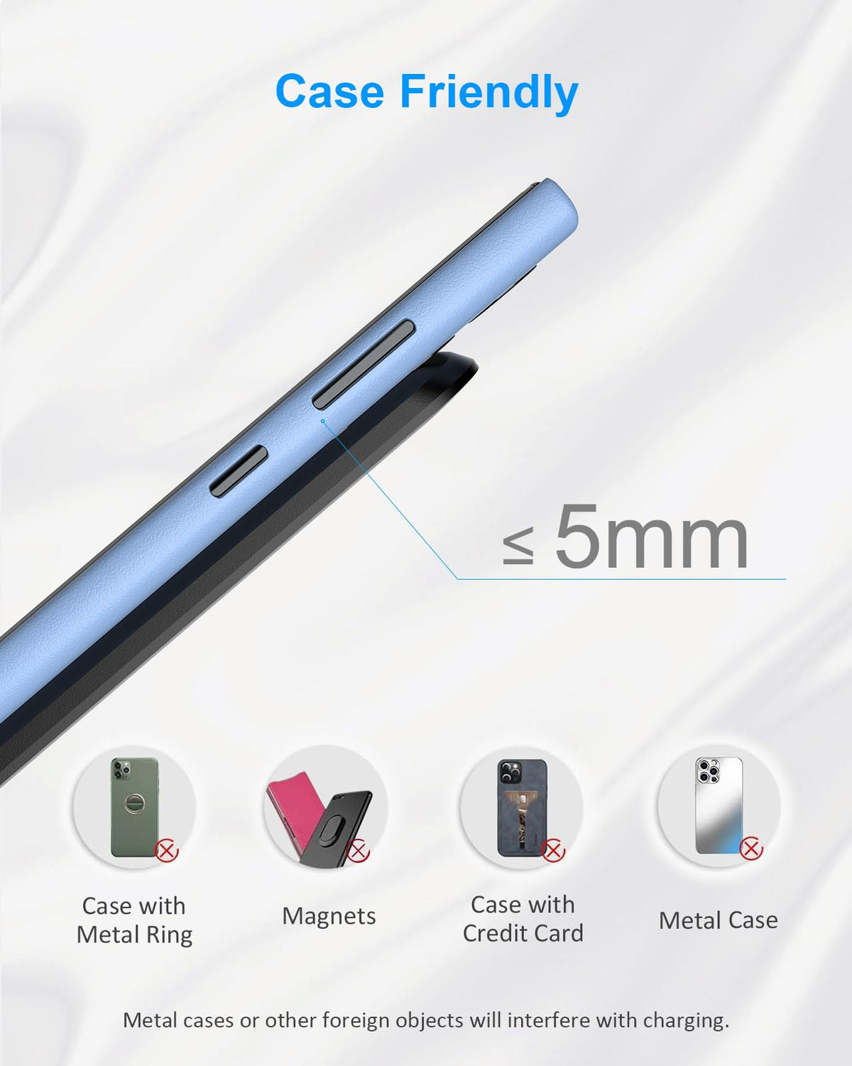Q: What materials are used in the construction of the Nanami Wireless Charger Stand?A: The Nanami Wireless Charger Stand is designed with a durable build and features an anti-slip silicone rim for added stability. It is suitable for use with cases made of rubber, plastic, or TPU that are less than 5 mm thick.