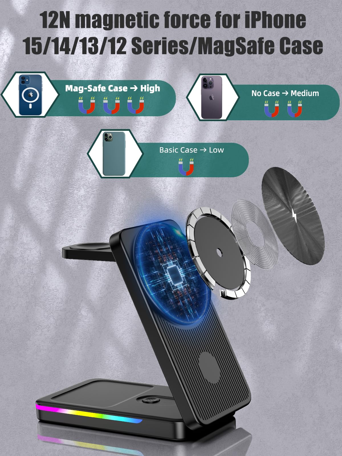 Wireless Charging Station For Apple Magsafe Charger, 3 In 1 Magsafe Charger Stand For Iphone 15 Pro Max/14/13/12, Foldable Magsa