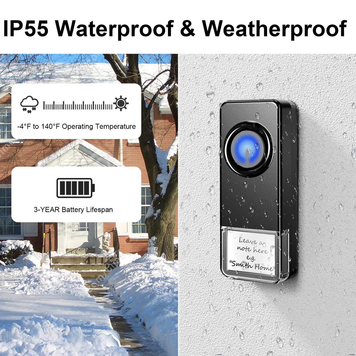 Q: Is the doorbell waterproof?A: Yes, the PHYSEN Wireless Doorbell includes waterproof push buttons, ensuring durability and functionality even in outdoor conditions.