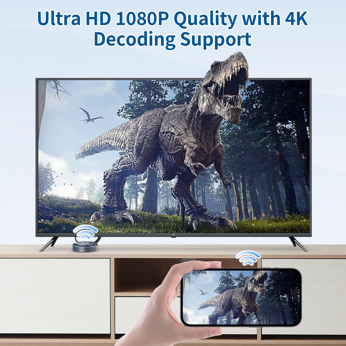 Q: Does the adapter support 4K resolution?A: Yes, the TPUFO Wireless HDMI Display Dongle Adapter supports 4K decoding, allowing you to enjoy stunning HD experiences with impressive 1080P Full HD output. This makes it perfect for watching movies or playing games on a larger screen.