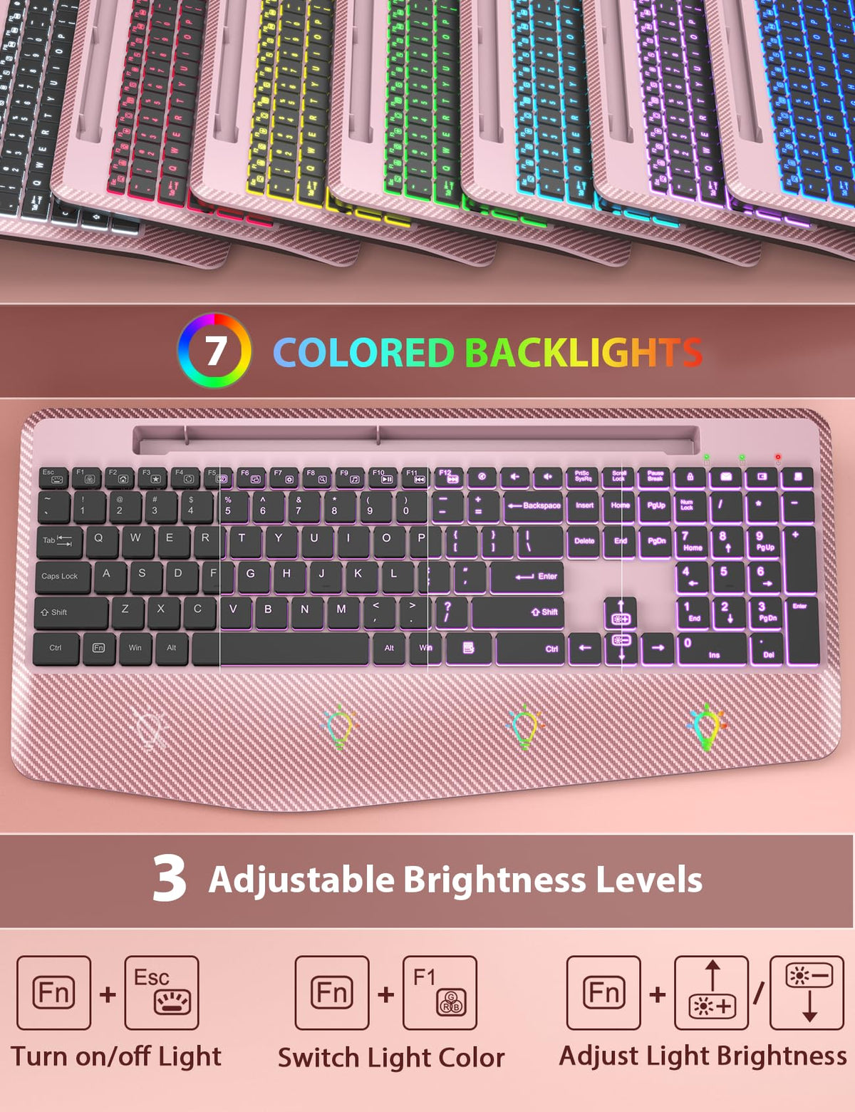 Wireless Keyboard And Mouse Backlits, Wrist Rest, Jiggler Mouse, Rechargeable Ergonomic Keyboard With Phone Holder, Silent Light