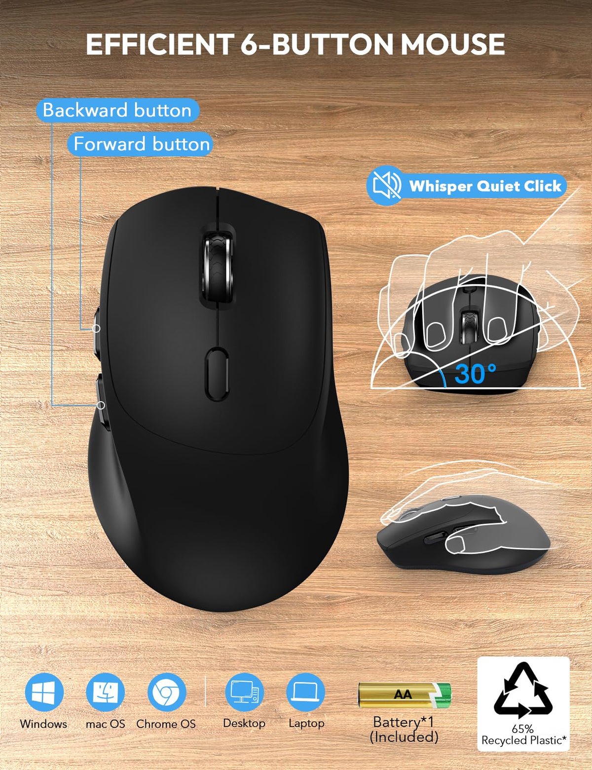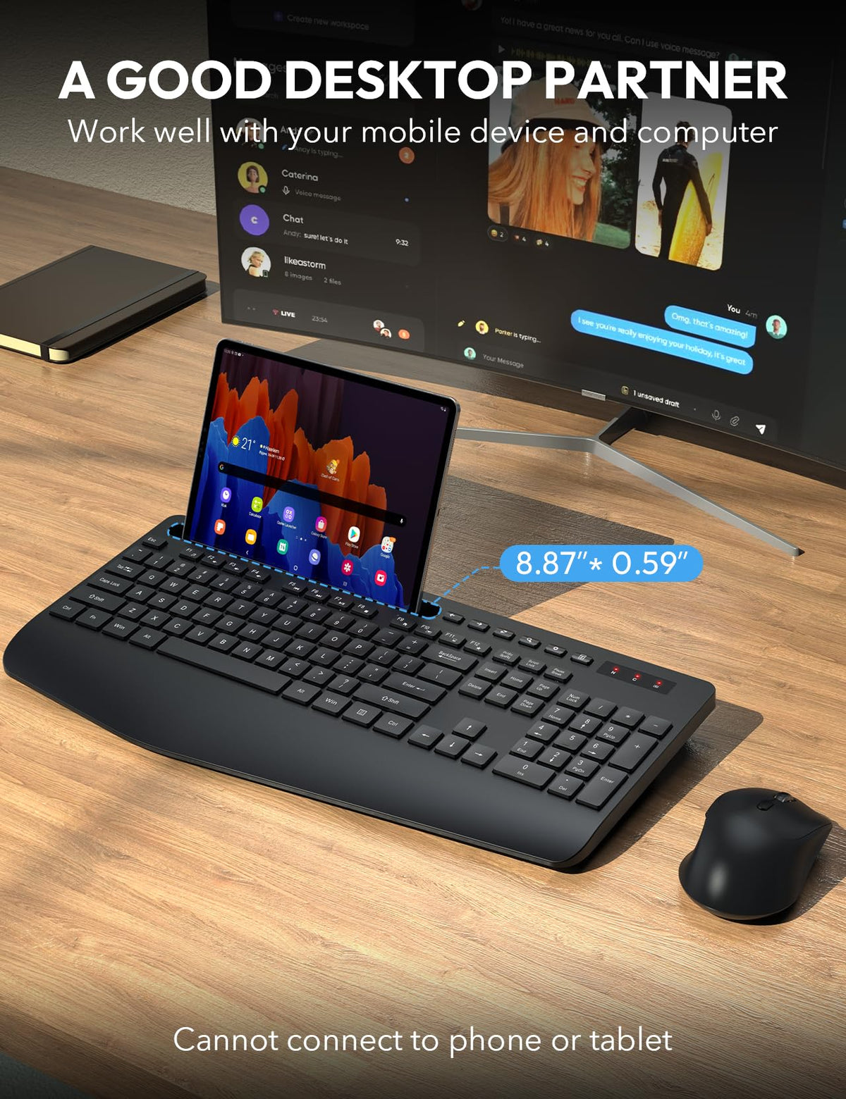 Ergonomic Design For Ultimate Comfort Wrist Rest: Our 2024 Upgraded Ergonomic Wireless Keyboard Comes With A 2.8-Inch Wide Wrist Rest, Providing Exceptional Hand Support. The 10 Tilt Angle Prevents Wrist Strain, Making Every Typing Session More Comfortable And Enjoyable. Seamless Multitasking Multitasking Holder: The Full-Size Keyboard Is Equipped With A Built-In Holder That Accommodates Phones And Tablets Up To 11.9 Inches. This Feature Allows You To Multitask Effortlessly, Ensuring You Never Miss Important Notifications Or Updates While Using Our Wireless Keyboard And Mouse Combo. Energy-Efficient Solution Trouble-Saving Solution: Say Goodbye To Frequent Charging With Our Power-Efficient Combo. The Keyboard And Mouse Are Powered By 2 Aaa Batteries And 1 Aa Battery (Included), Featuring A Built-In Smart Sleep Mode That Conserves Energy. After 90 Seconds Of Inactivity, The Devices Enter Sleep Mode And Can Be Reactivated By Pressing Any Button, Saving Power And Reducing Hassle. Enhanced Efficiency And Smoothness Efficient Keyboard And Mouse: Our Keyboard Not Only Includes The Standard F1-F12 Shortcut Keys But Also 6 One-Touch Hotkeys For Added Convenience. Paired With A 6-Button Mouse That Offers 3-Level Tarcking Speed Settings And Forward/Backward Functions, This Combo Significantly Boosts Your Browsing Efficiency And Smoothness. Silent Operation For Minimal Disruption Disturb No One: The Soft Membrane Gaming Keyboard Ensures Consistent Keystroke Transmission While Reducing Typing Noise By 95%. The Wireless Mouse Features Silent Micro Motion Technology, Making Its Clicks Almost Completely Silent. Now You Can Work Or Game Late Into The Night Without Disturbing Others Around You.
