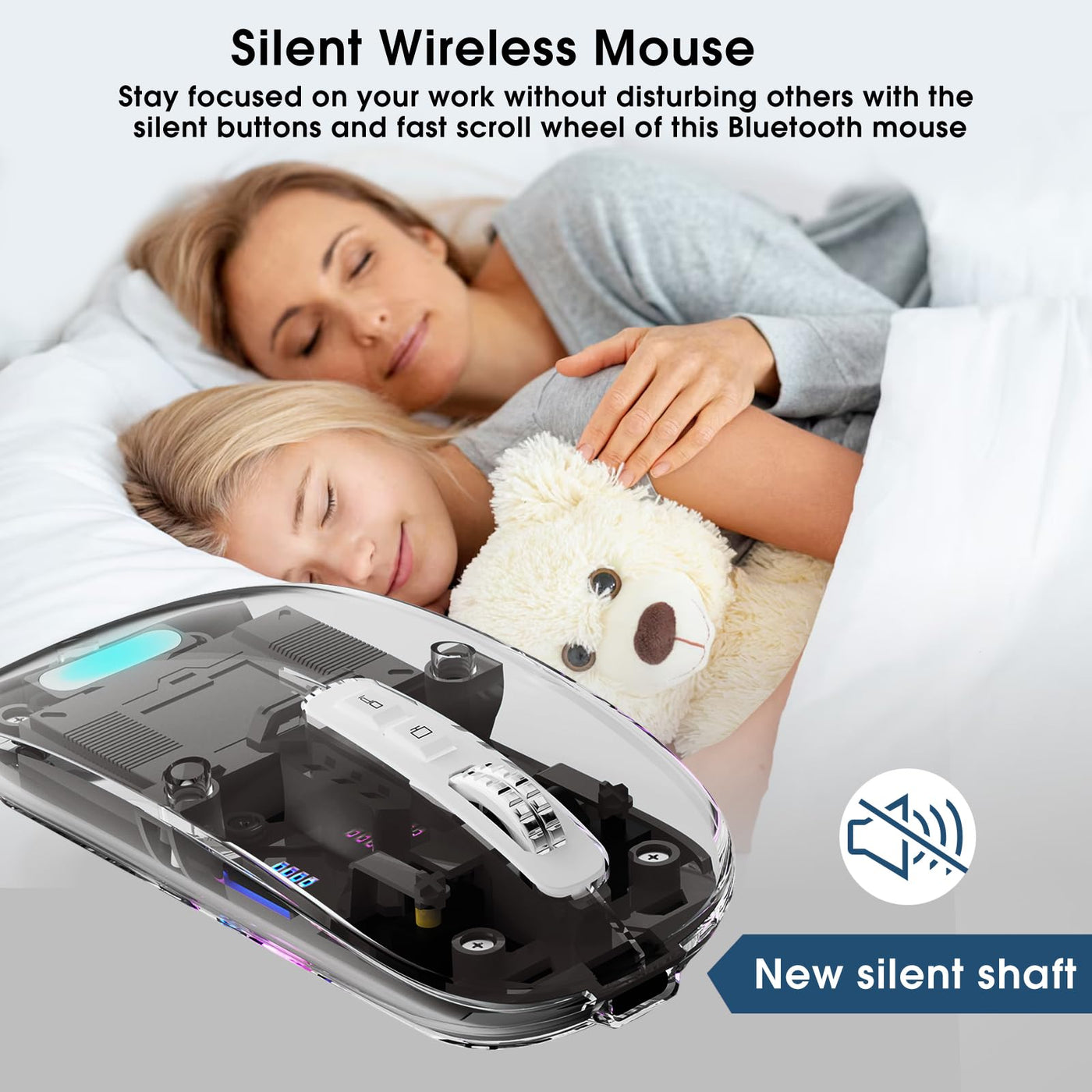 Q: What makes the design of this mouse unique?A: The Wireless Transparent Mouse features a transparent case design that is digitally engineered for a stylish look. It also includes ambient lighting patterns that enhance its visual appeal, making it a modern accessory for your workspace.