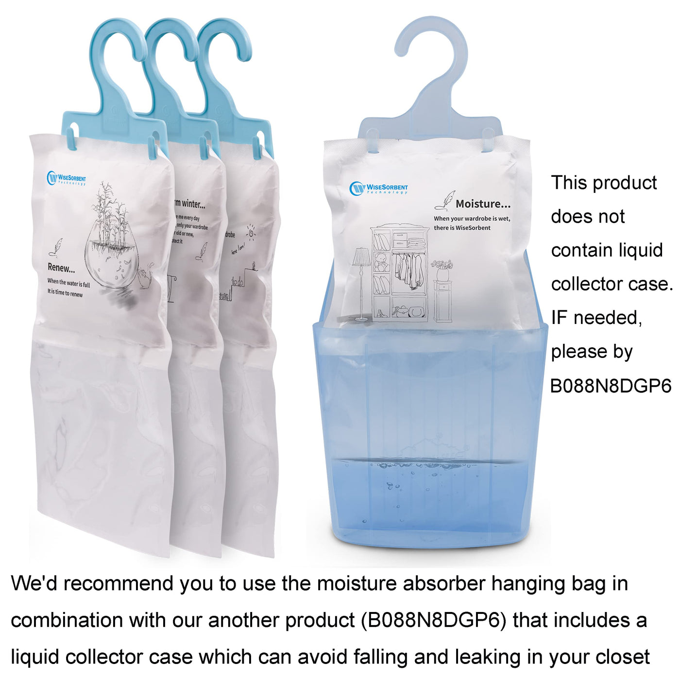 ?High Quality Moisture Absorption Paper, Great Absorbing Capacity Calcium Chloride?: Moisture Absorbers Hanging Bag Utilize High Quality Paper As Calcium Chloride Packaging Material, Good Breathability And Dust Free. Each Dehumidifier Bag Is Capable Of Absorbing 500Ml Moisture. It Is Suggested To Use One Moisture Absorber Bag In An Enclosed Environment No Larger Than 70 Cubic Feet. ?12Pcs Of Hanging Bag With 6Pcs Detachable And Reusable Hanging Hooks?: High Quality Plastic Hanger Are Solid And Secure Enough To Hang Around The House To Collect Moisture And Musty Odor Out Of The Air. We'D Recommend You To Use The Moisture Absorber Hanging Bag In Combination With Our Another Product (B088N8Dgp6) That Includes A Liquid Collector Case Which Can Avoid Falling And Leaking In Your Closet. ?Visible Effectiveness & Fragrance-Free & Easy & Safe To Use?: You Can Visually Tell How Much Moisture And Dampness Be Absorbed And Collected By Simply Checking The Bottom Of The Bag Filling Up With Liquid From Dehumidifying The Air. Hang The Moisture Absorbing Bags Anywhere For Dehumidifying Freely. Wisesorb Hanging Bags Provide An Easy Solution To Protecting Valuables And Cloths From Excess Moisture. ?Widely Used?: Moisture Absorber Humidity Packets Are Applicable In A Number Of Places, Such As, In Your Closet, Wardrobes, Basement, Laundry Room, Bathroom, Camper And Other Enclosed Spaces. Moisture Absorber Hanging Bags Protect Your Valuables From Excess Moisture Damage And Musty Smell. ?Packages Includes?: Packages Includes 12Pcs Hanging Moisture Absorber And 6Pcs Hooks (Detachable And Reusable). Moisture Absorber Hanging Bags Collect Much Humidity In Your Closet, Wardrobes, Basement, Laundry Room, Household, Bathroom, Kitchen, Shoe Cabinet, Car, Cat'S Litter Box, Camper. Please Understand That This Product Is The Refill Hanging Bags For Asin B088N8Dgp6 And Dont Contain Liquid Collector Case.