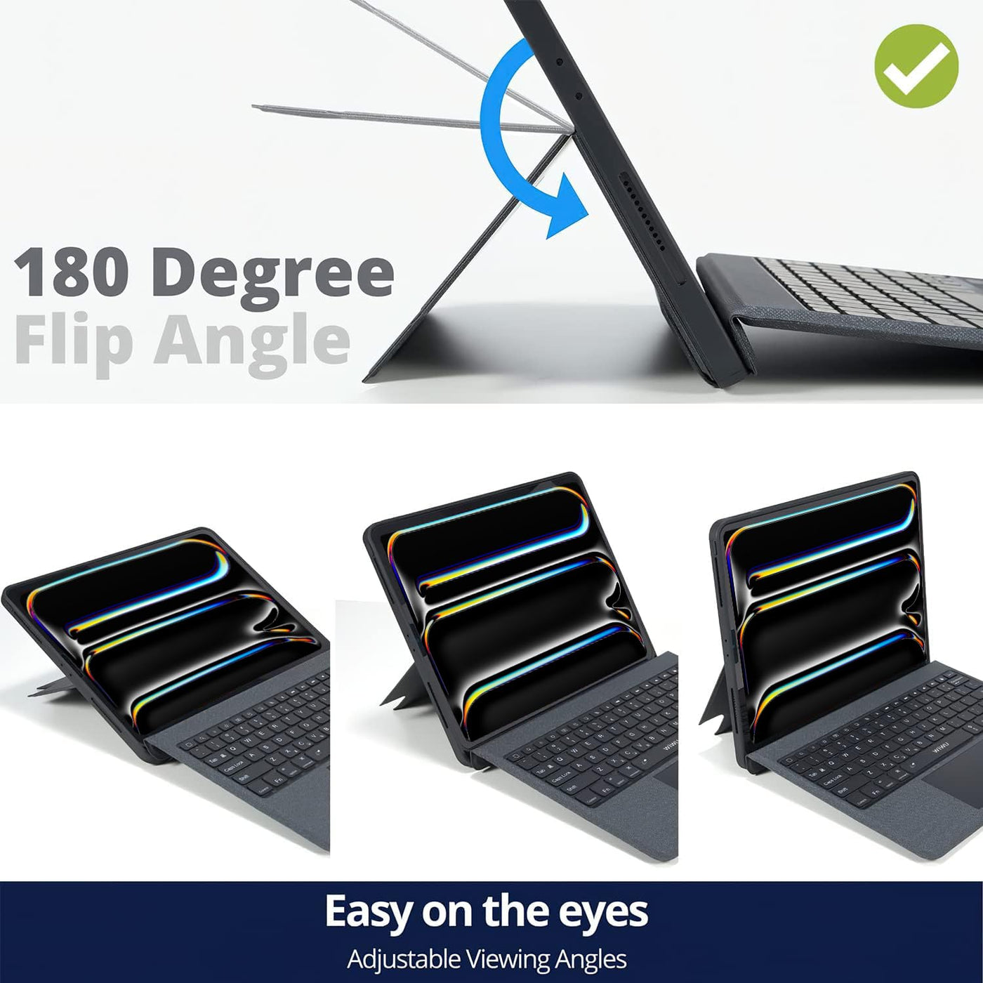 Q: What are the features of the detachable keyboard?A: The detachable keyboard features a magnetic connection, making it easy to remove and store separately. It also includes a full row of iPadOS shortcuts, a responsive trackpad that supports multi-touch gestures, and 7 customizable RGB backlight colors with adjustable brightness levels.