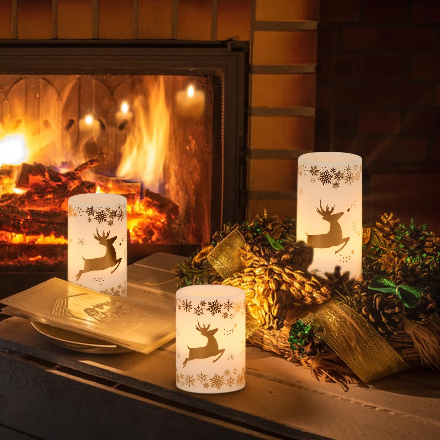 Wondise Flameless Flickering Candles With 6H Timer, Gold Deer Christmas Battery Operated Candles 3 Pack Real Wax Warm Light Led