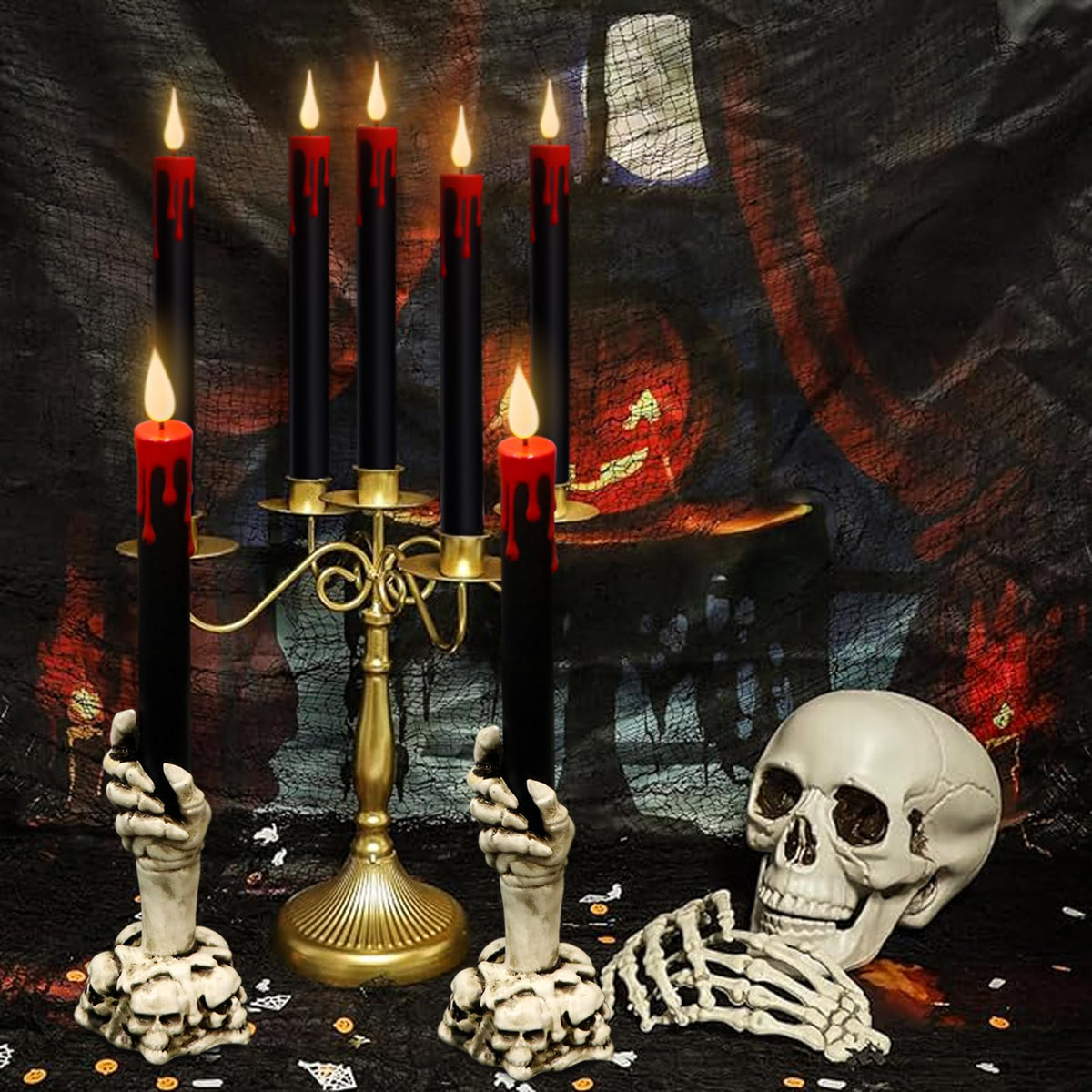 Wondise Halloween Flameless Taper Candles With Remote And Timer, Black Battery Operated Dripping Wax Led Flickering Candles With Skeleton Hand Holders For Halloween Decoration(2 Pack, 3 X 12 )
