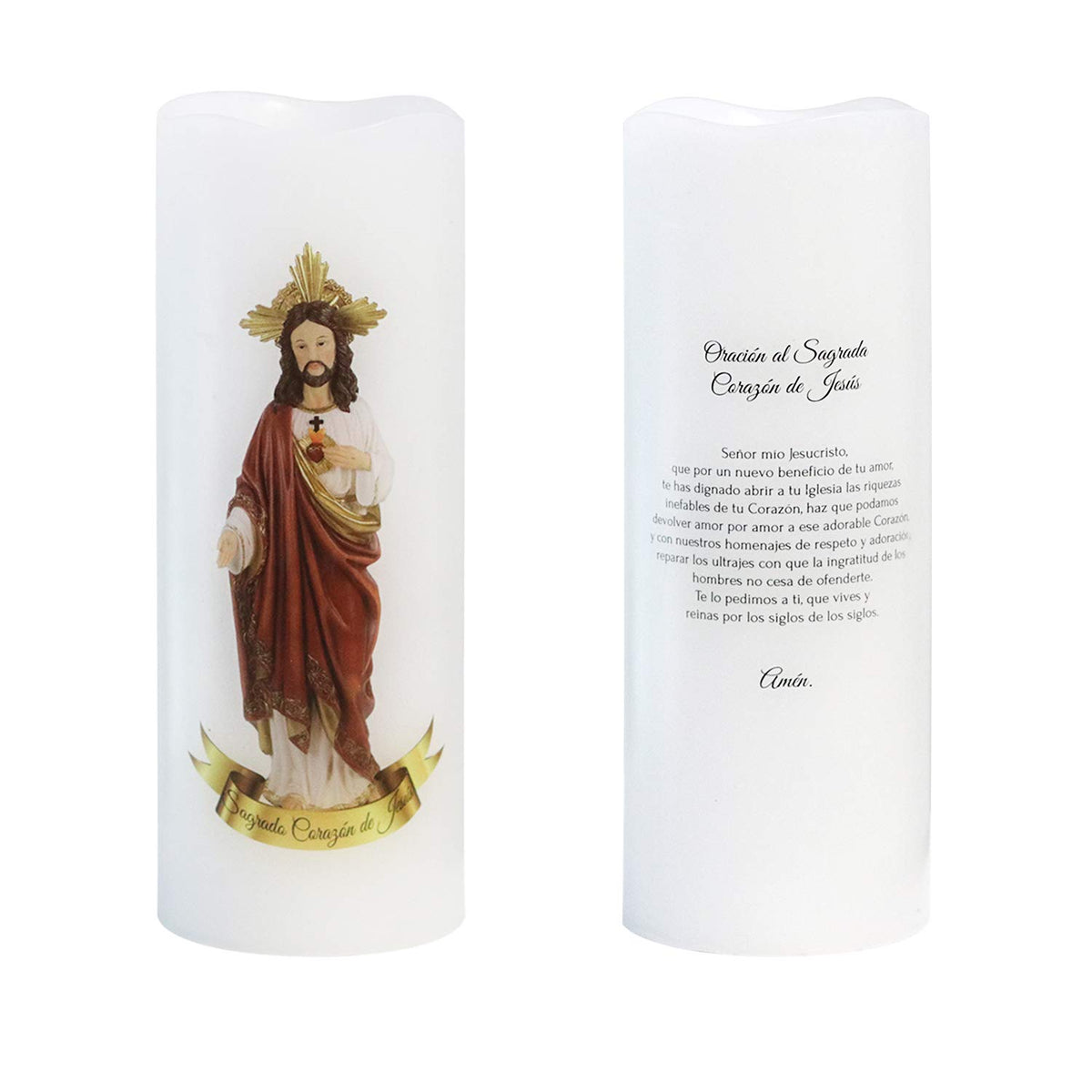 Wondise Sacred Heart Of Jesus Picture Devotional Prayer Candle With Remote And Timer, Battery Operated Real Wax Led White Candle For Decoration Religious, Prayer In Spanish(3 X 3 X 6 Inch)