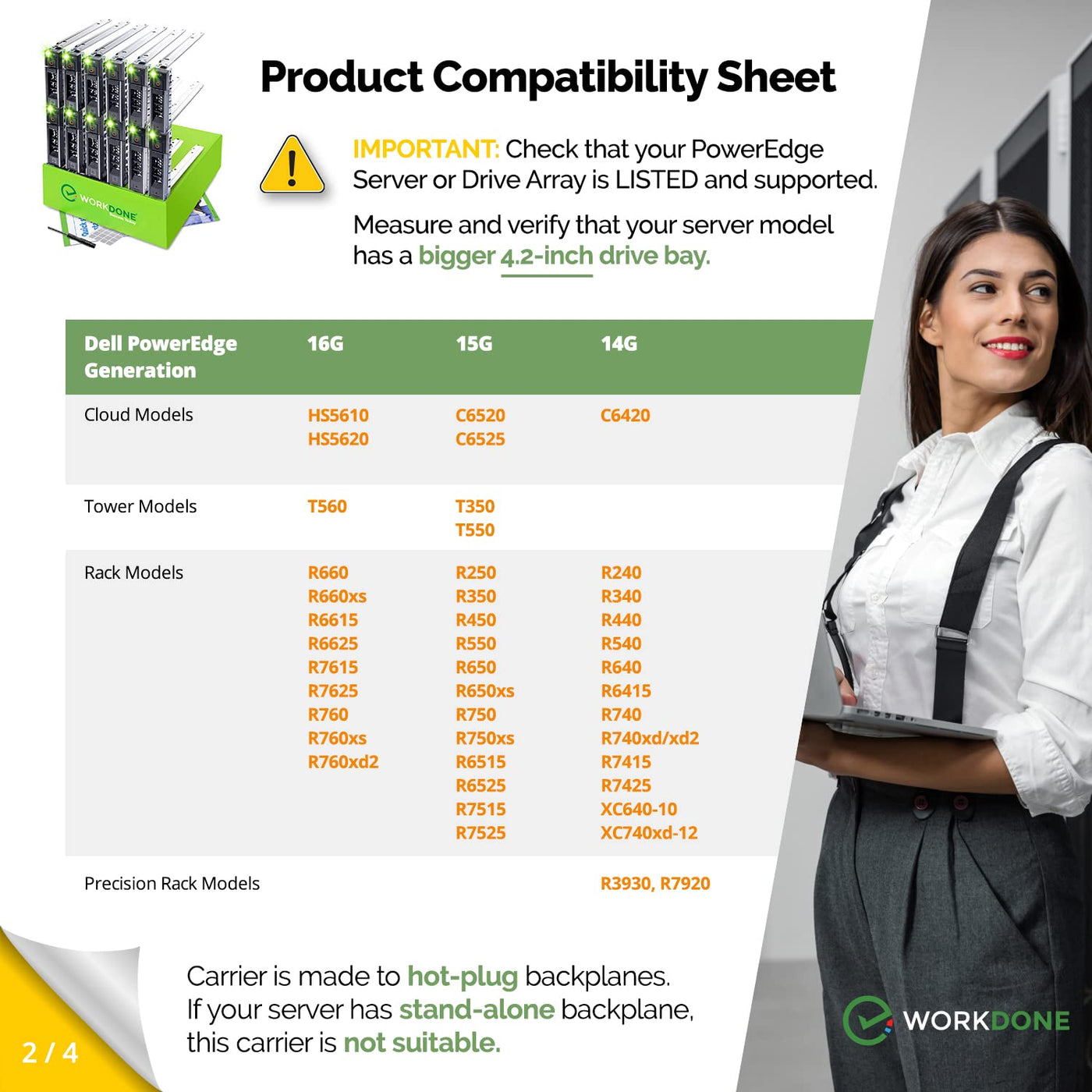 Quick And Easy Setup With Workdone 12-Pack Hot-Plug Caddy! Press The Release Button To Open The Release Handle And Slide Hot Plug Caddy Inside Or Outside Of Your Server. The Hot-Plug Workdone Caddy 3.5 Is For Connecting A Hard Drive To A Server Backplane. Your Server Backplane Is Connected To A Raid Controller. After Installation, You Can Adjust Or Create Raid Volume From The Raid Controller Menu.&Nbsp; Workdone Hard Drive Trays Are The Complete Package! Workdone 12-Pack Drive Enclosure Bracket Compatible For Dell Poweredge To 3.5 Inch Sas Or Sata Hard Drives Sticker Label Sheets Screwdriver48 Strong Mounting Screws And Amount Of Extra Screwsdetailed Printed Installation Manual Workdone 12-Pack Design And Packaging! Dive Trays Are Checked One-By-One And Packed Carefully To Ensure Safe Shipping. You Will Receive Your Sturdy Drive Tray And All The Screws You Need To Install It Right Away. Our Newly-Designed 3.5-Inch Hard Drive Trays Are Compatible With A Wider Range Of Poweredge 14Th Generation Servers: 14Th Generation R240 Tray, R340 Caddy, R440 Caddy, R540 Caddy, R640 Caddy, R740 Caddy, R740Xd Caddy, R740Xd2 Caddy, R6415 Caddy, R6515 Caddy, R6525 Caddy, R7415 Caddy, R7425 Caddy, R7515 Caddy, R7525 Caddy, Xc640 Caddy, Xc740Xd Caddy, Xc740Xd-12 Caddy, C6420 Enclosure (Not C6420 Sled) When You Buy From Workdone, You Have The Support Of An Expert Team Behind You.&Nbsp;Workdone Helps You Get Your Work Done!