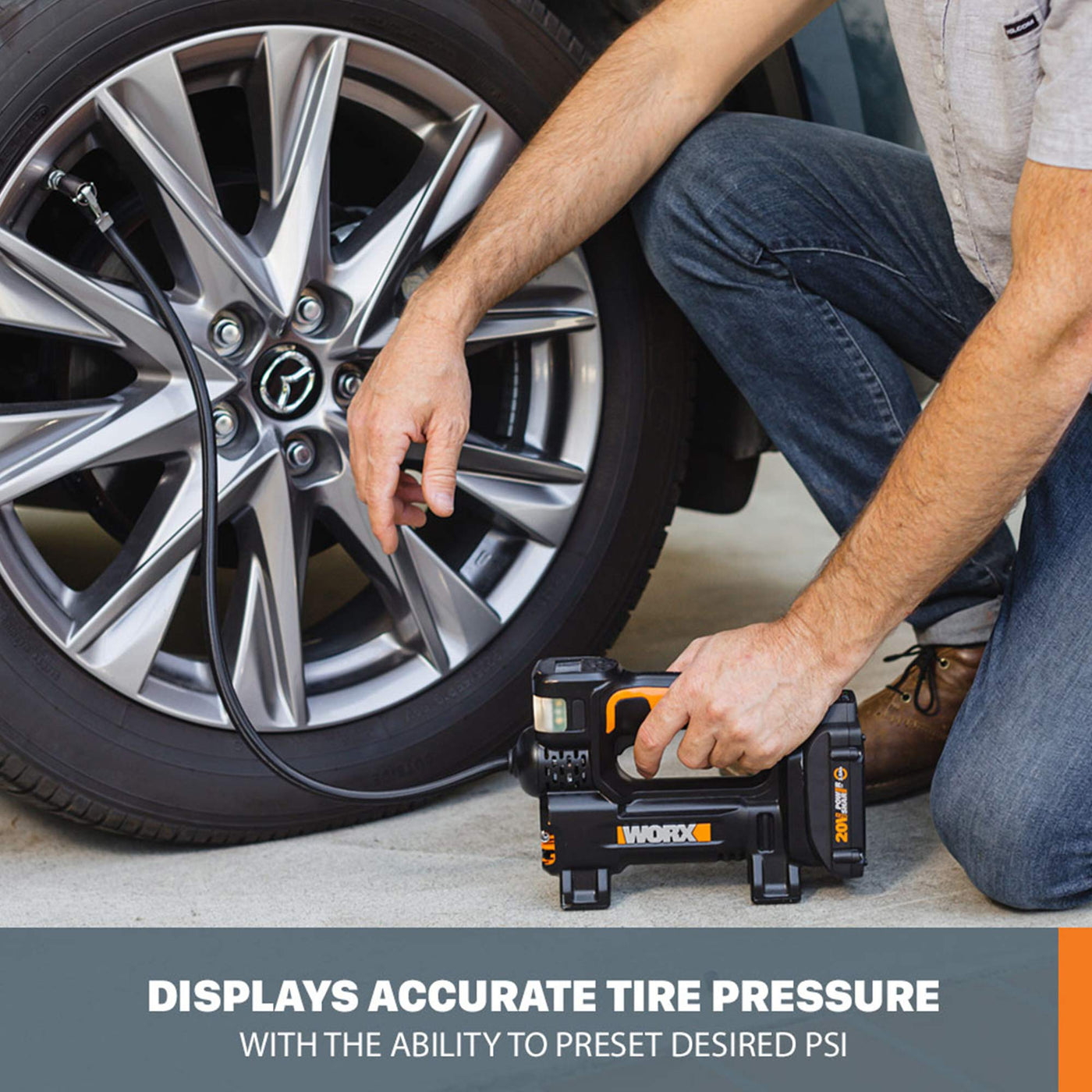 You Can Inflate All The Tires On The Car And Then Some With The Worx 20V Power Share Portable Inflator It Fills Up 45 Tires On One Charge And It Goes From 0-36 Psi In About 4 Minutes Per Tire Thatas Faster And More Efficient Than Inflators From Other Brands And You Donat Have To Plug It Into Your Caras Dc Port And Then Park Some Place Thatas Convenient To Use It Take It To The Pool, The Dock, Even Pack It For A Long Bike Ride, Itas The Ultimate In Portability And Convenience The Led Lamp Outputs 100-200 Lumens And Can Be Used As A Work Light So You Can See What Youare Doing, A Flashlight If You Need To Take A Walk In The Dark To A Service Station, Even An Emergency Beacon To Alert Other Motorists That You Need Assistance The Flexible 3-Foot Hose Lets You Reach Nozzles And Stems That Are Hard To Get At, And It Comes With 3 Adaptors: 1 Sports Ball Needle, 1 Presta And Bike Valve Adaptor, 1 Tapered Adaptor For Small Inflatables Like Pool Toys Plus, The Soft-Grip Handle Is Comfortable To Hold And Use For Long Stretches Keep The Worx 20V Power Share Portable Inflator In Your Trunk And Gain The Peace Of Mind You Get From Being Prepared This Model Does Not Include A Worx Power Share Battery Or Charger