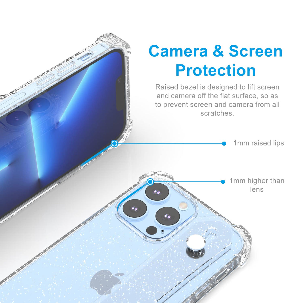 Q: What kind of protection does this case offer for my iPhone 13 Pro?A: This case features shock-absorbing air cushion corners and a raised bezel that lifts the screen and camera off flat surfaces, providing excellent protection against drops and scratches.