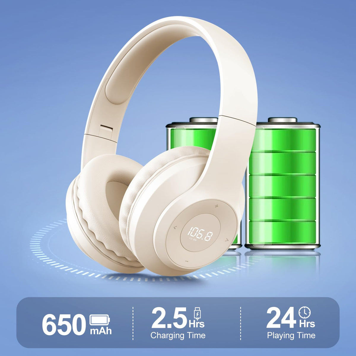 Q: How do the rechargeable batteries work in the X5 headphones?A: The X5 headphones are powered by a built-in 650mAh rechargeable lithium battery that takes about 2.5 hours to fully charge. This eliminates the need for disposable AA or AAA batteries, providing a more eco-friendly and cost-effective solution for listening to FM radio.