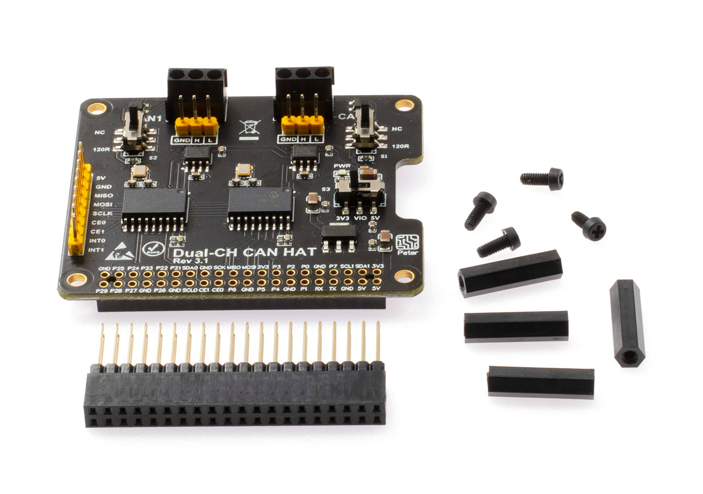 Q: What is included in the package when I purchase the XICOOLEE CAN HAT?A: The package includes one Dual-CH CAN HAT, a 2×20 PIN female header, two nylon pillars, and four screws. Note that the Raspberry Pi shown in the photos is not included.