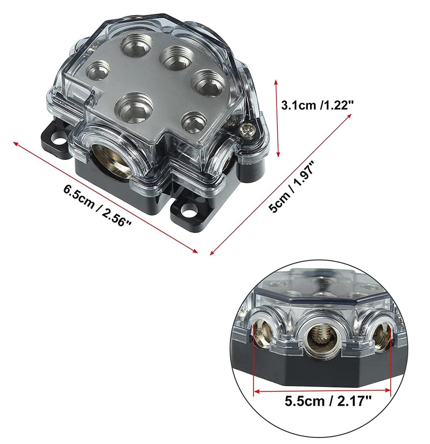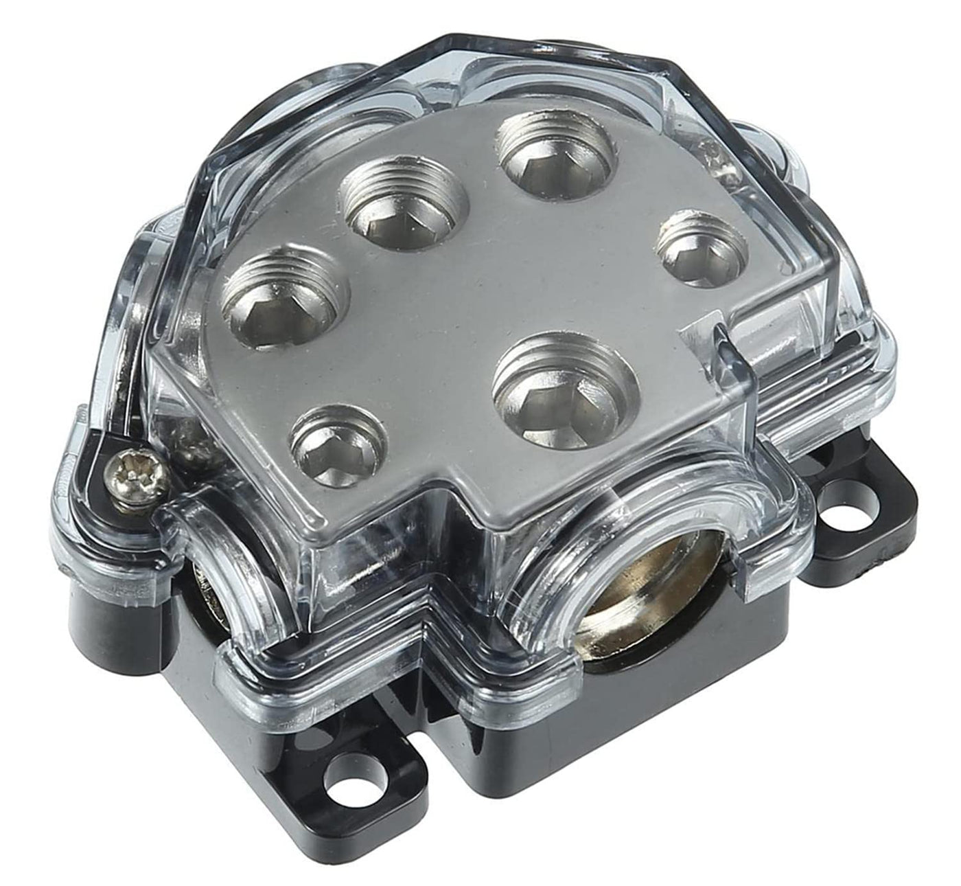 Specification: Type: Distribution Block Material: Zinc Alloy, Plastic Color: Black, Silver Tone Electrical Connection: 0/2/4Ga X 1 Input (12Mm), 2/4/8Ga X 5 Output Size: 6.5X5X3.1Cm / 2.56''X1.97''X1.22''(L*W*H) Diameter Of Mounting Hole: 5Mm / 0.20'' Distance Between 2 Mounting Holes: 5.5Cm / 2.17'', 4.5Cm / 1.77'' Inlet Diameter: 12Mm / 0.47'' Outlet Diameter: 10Mm / 0.39'', 9Mm / 0.35'', 6Mm / 0.24'' Package Included: 1 Pcsx Car Power Distribution Block