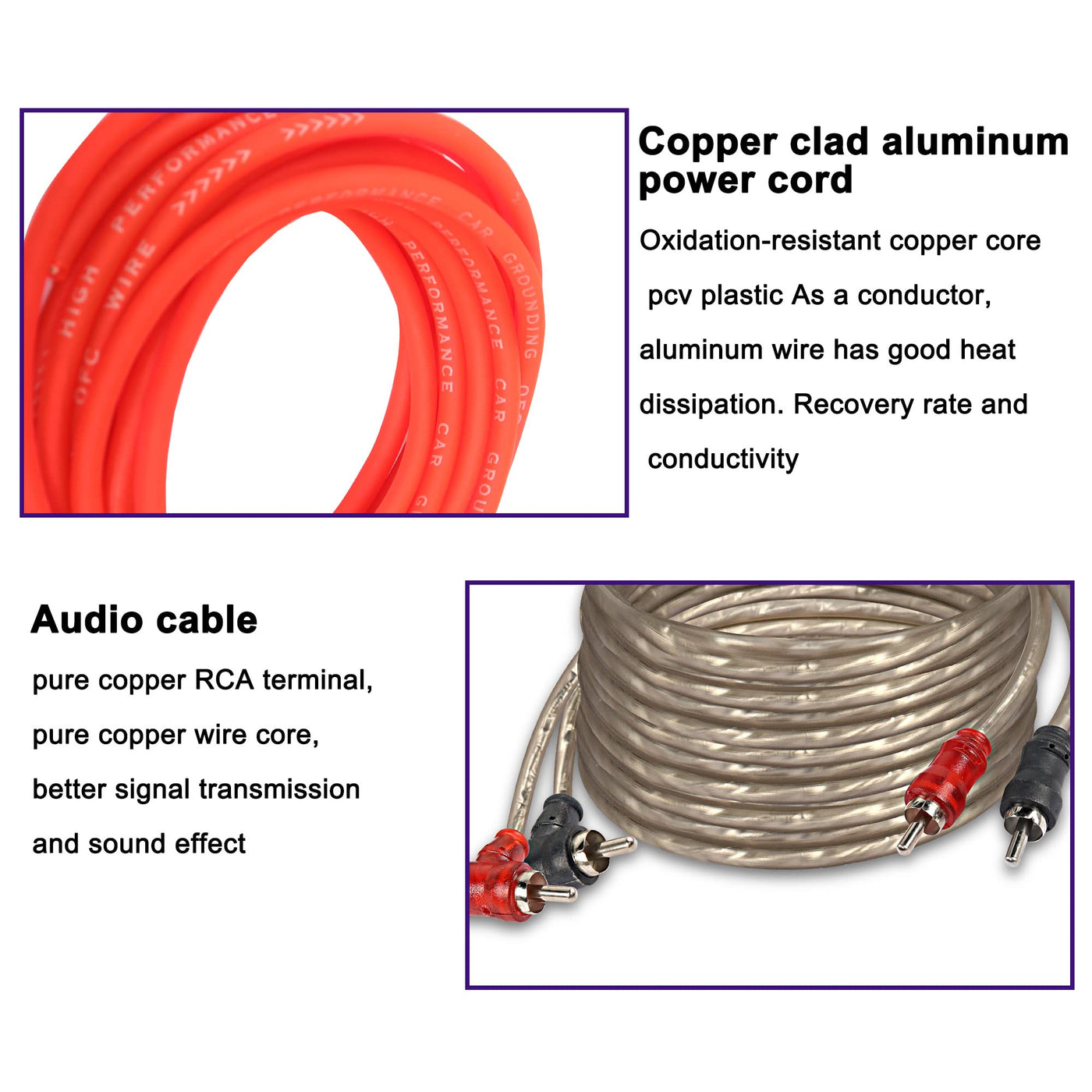 Q: What materials are used in the wiring kit?A: The kit features high-quality, durable materials including heavy-duty oxygen-free copper and copper-clad aluminum for excellent conductivity, along with a wear-resistant PVC cable sheath.