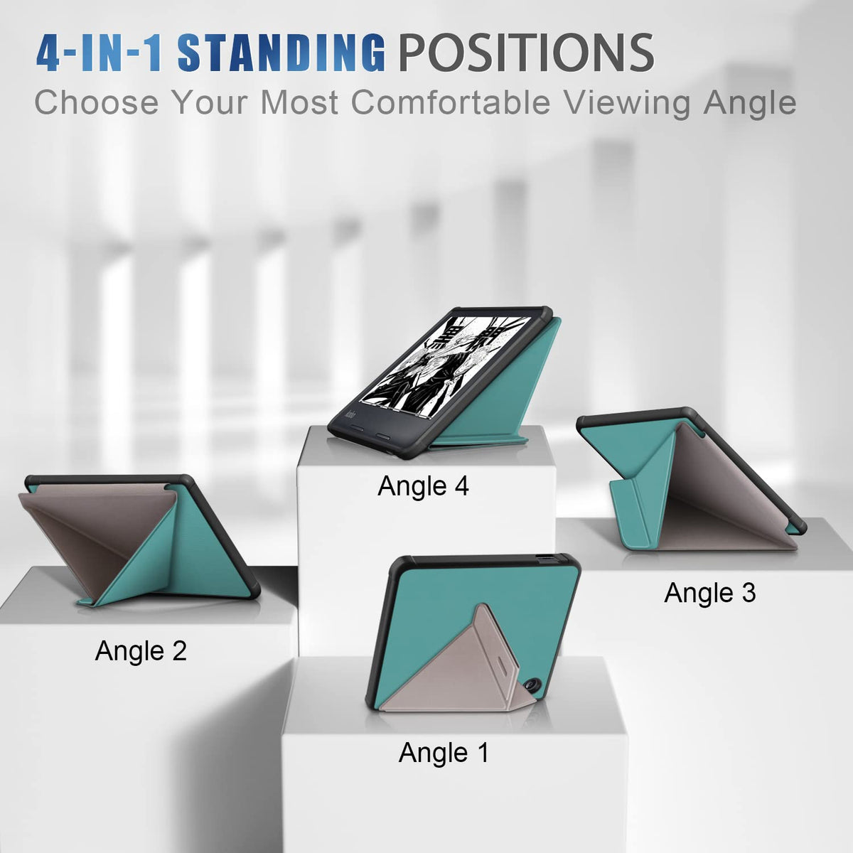 Q: What are the benefits of the foldable stand design?A: The foldable stand design offers four comfortable viewing angles, allowing you to switch between vertical and horizontal orientations easily. This enhances your reading experience by providing optimal viewing positions.