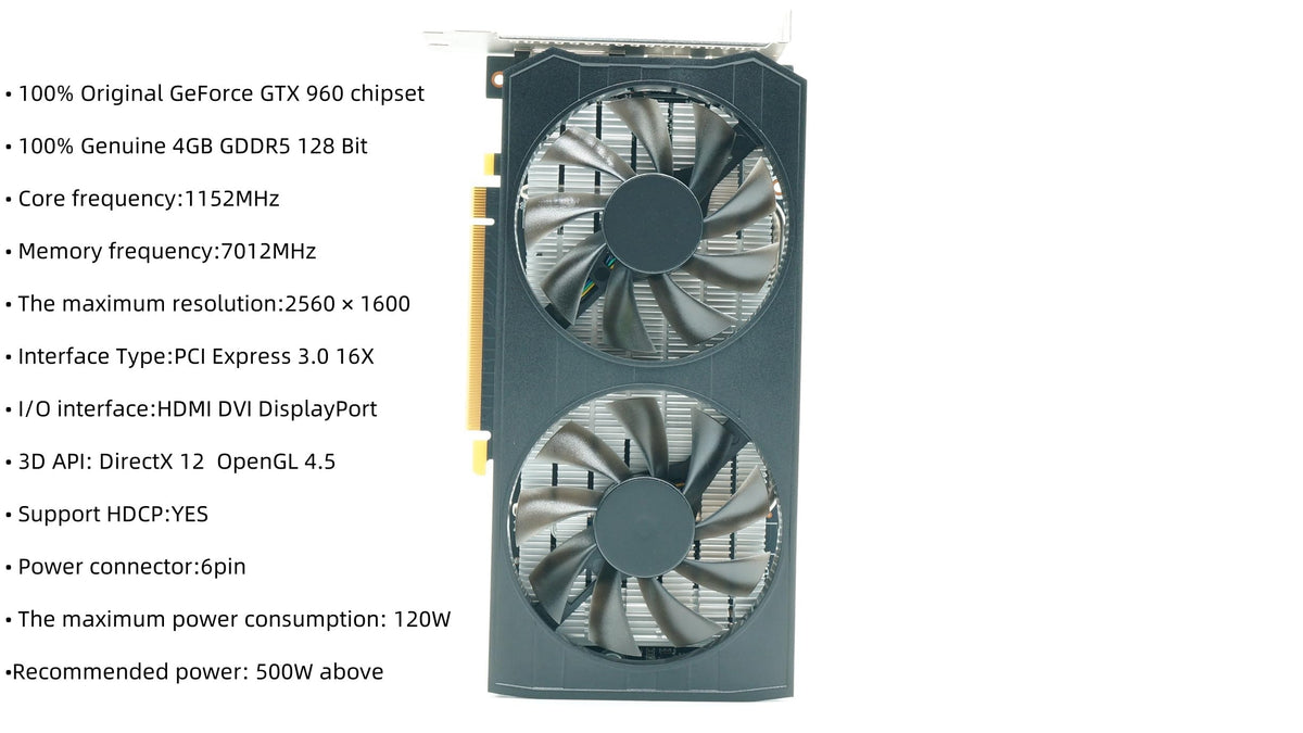 Favorable Prices For New Products ,Awesome Performance For The Price ,Please Trust Us And Trust Your Choice. Xuanmo Exclusive Features Base/Boost Clock: 1190Mhz/1140Mhz Optimized Swept Fan Blades Double Ball Bearings For 4X Longer Lifespan 26% Cooler, 36% More Gpu Power 1X Displayport 1.2, Hdmi 2.0 And Dvi-I 250% Lower Fan Power Consumption Gpu Features Evga Backplate Nvidia Dynamic Super Resolution Technologynvidia Mfaa Technologynvidia Gameworks Technologynvidia Gamestream Technologynvidia G-Sync Readymicrosoft Directx 12 (Feature Level 12_1)Nvidia Gpu Boost 2.0Nvidia Adaptive Vertical Syncnvidia Surround Technologynvidia Sli Readynvidia Cuda Technologyopengl 4.4 Supportopencl Supporthdmi 2.0, Displayport 1.2 And Dual-Link Dvipci Express 3.0 X16 Core 1024 Cuda Coresbase Clock: 1304 Mhzboost Clock: 1367 Mhzbus: Pci-E 3.02-Way Sli Ready Memory Memory Detail: 4096 Mb Gddr5Memory Bit Width: 128 Bitmemory Clock: 7010 Mhzmemory Speed: 0.28 Nsmemory Bandwidth: 112.16 Gb/S Product Name Gtx960 4Gb Gddr5 128Bit Core Code Gm206 Chip Manufacturer Nvidia Memory Capacity 4Gb Memory Type Gddr5 Memory Bandwidth 128Bit Memory Frequency 7012Mhz Core Frequency 1152Mhz Cuda Core 1024 Interface Type Pci-Express3.0 Maximum Resolution 4096*2160 3D Api Directx12 Maximum Power Consumption 140W Power Interface Yes Recommendations Power 300W Cooling Method Cooling Fan I / O Interface Hdmi+Dp+Dvi Graphics Card Weight 750G Graphics Card Size 22Cm*11Cm Package Dimensions 275*155*60Mm Product List Box+Graphics Card+Instructions For Use+Power Cable Warranty Policy 1 Years Free Warranty +Lifetime Paid Maintenance Production Batch Inventory Will Be Different In Appearance, But The Quality Of Its Core Functional Parameters Is Exactly The Same
