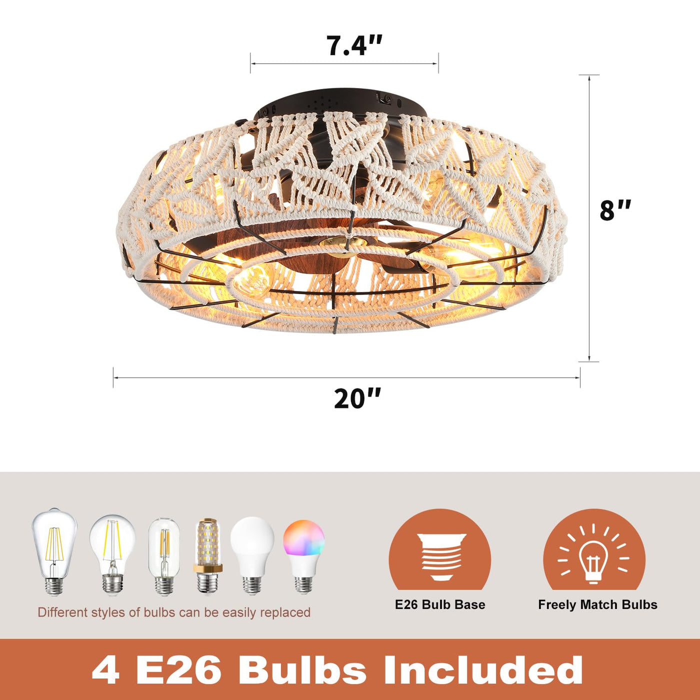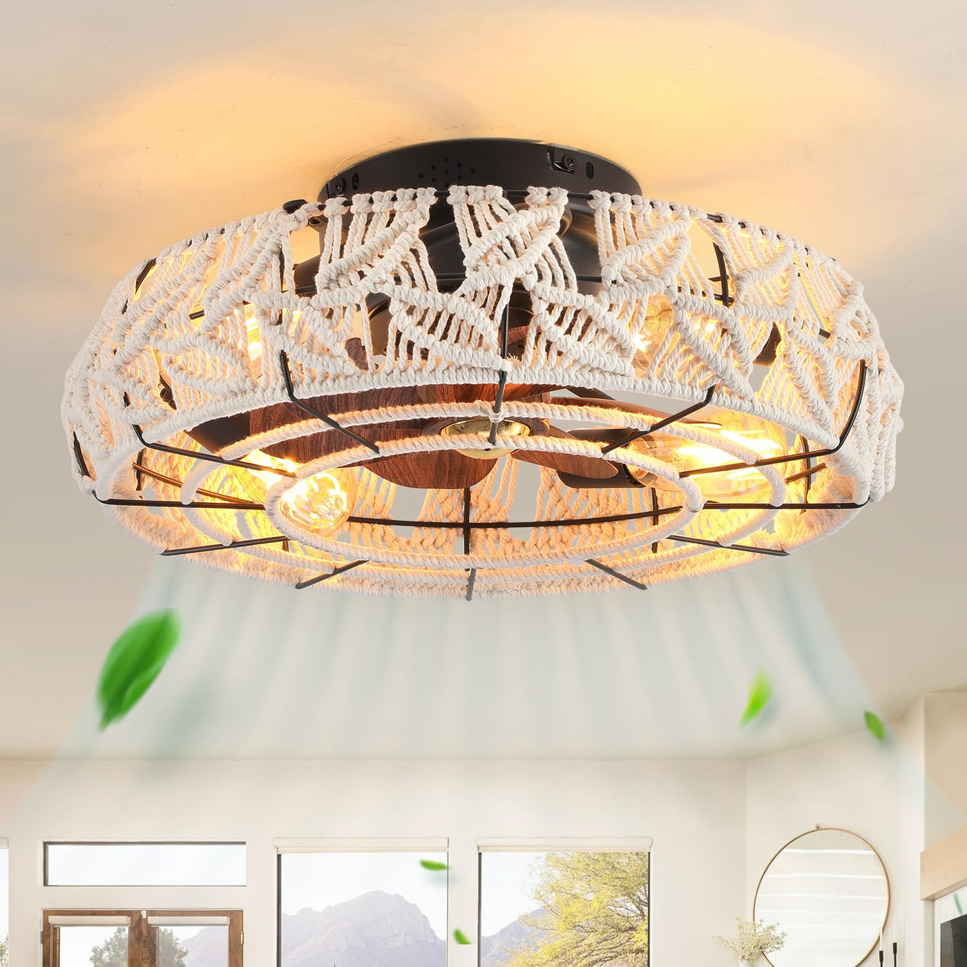 Xudom Boho Caged Ceiling Fans With Lights And Remote 20'' Flush Mount 6 Speed Reversible Enclosed Low Profile Handmade Cotton Ro