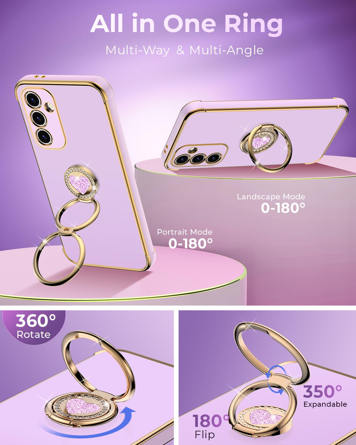 Q: How does the 2-way 360° ring stand work?A: The 2-way 360° ring stand features a heart-shaped design that can fold 180° and rotate 360°, allowing you to use your phone comfortably in both portrait and landscape modes.