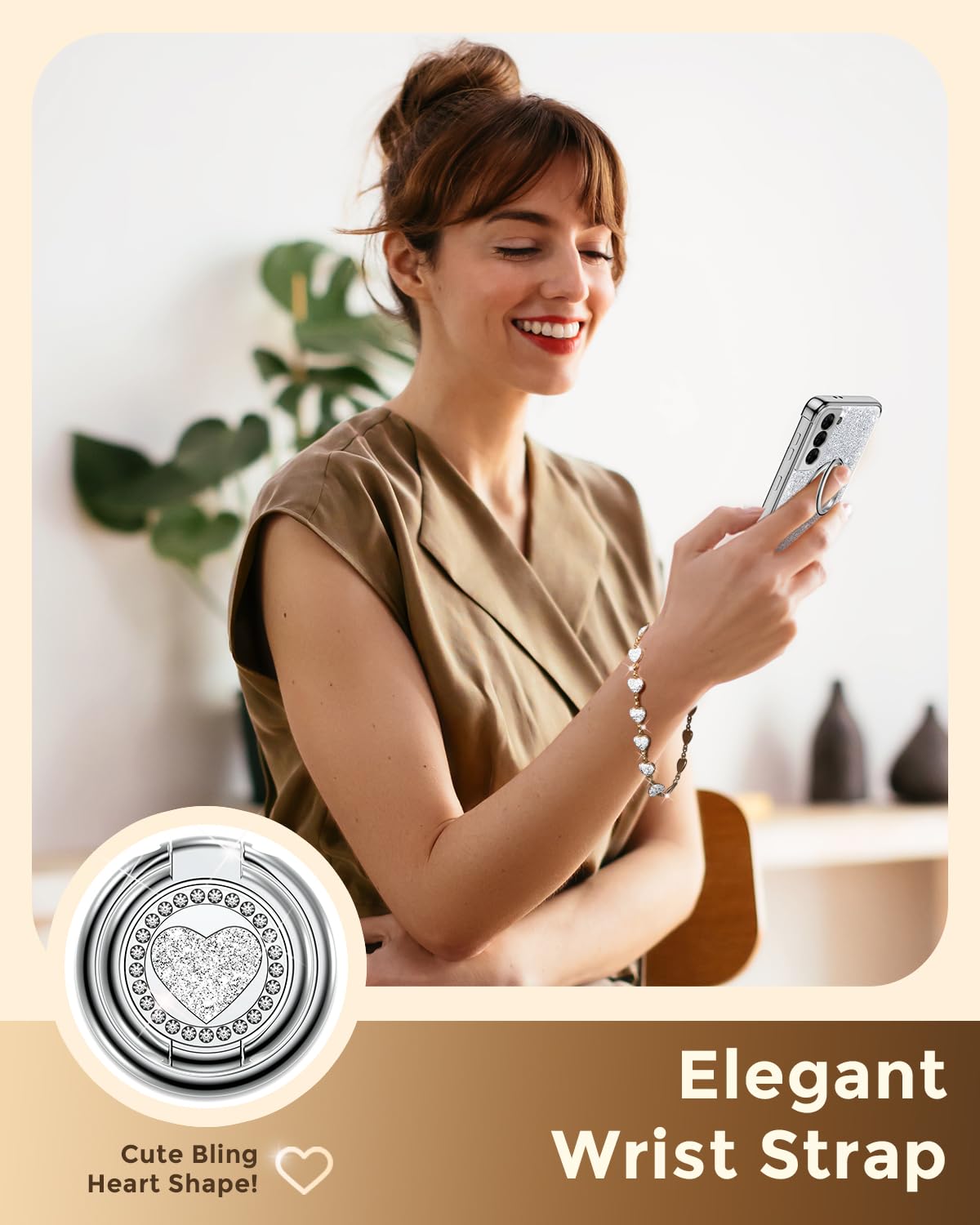 Q: How does the 360° ring stand work on this phone case?A: The 360° ring stand features a heart-shaped design that can rotate 360° and fold 180°, allowing you to comfortably hold your phone or prop it up for hands-free viewing.